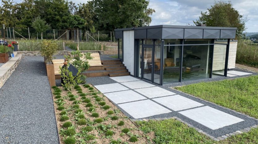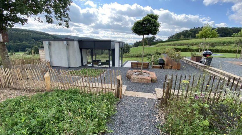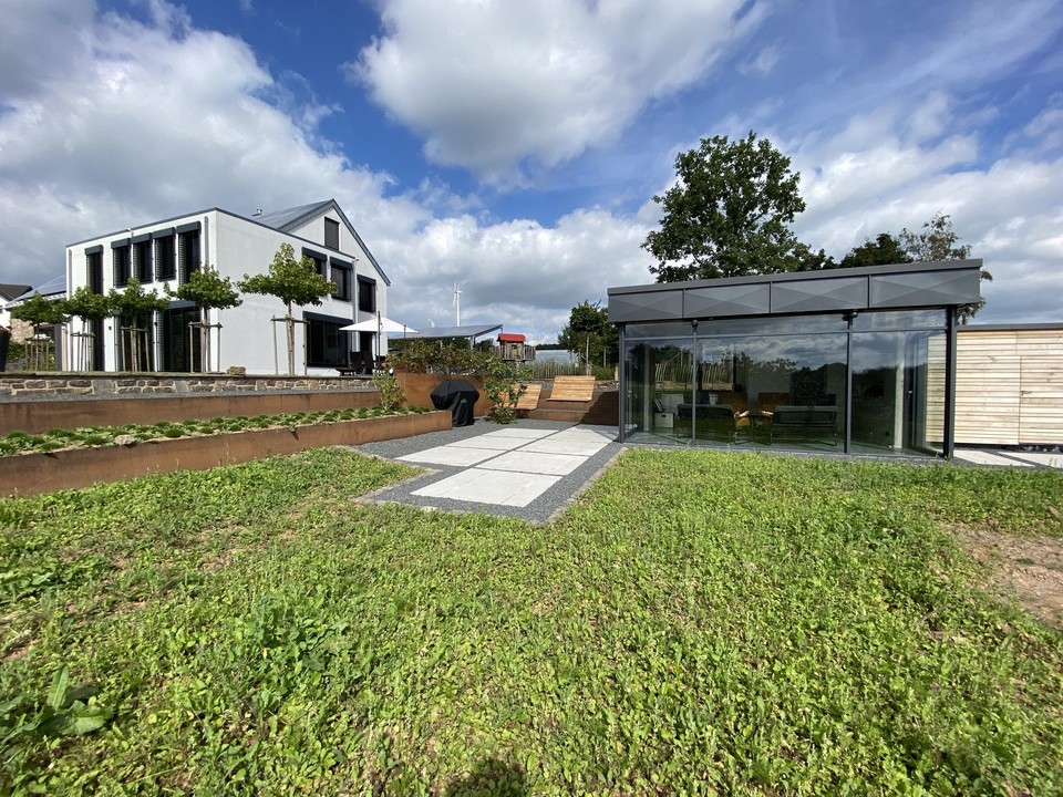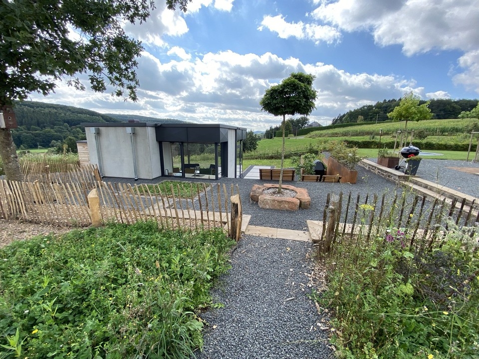 Herzstück der Garten- und Außenanlage ist ein liebevoll in die Natur eingebettetes, luxuriöses Gästehaus (32,80 m²). Die Tragkonstruktion besteht aus kerngedämmten Stahlbetonwänden in Sichtbetonoptik. Die großzügigen, über Eck verlaufenden Glasfassaden ermöglichen einen herrlichen Panoramablick in die Natur. Der von natürlichem Licht durchflutete Innenbereich wird durch eine Fußbodenheizung beheizt. Im Gebäude befindet sich ein gemauerter Pizzaofen.