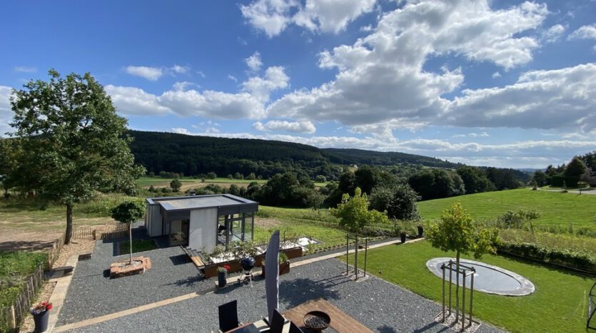 Exclusief wonen – droomwoning in de natuur: Eengezinswoning met bijgebouwen (schuur, tuinhuis, schuurtje, luxe kippenhok, garages en barbecue) op een perceel van ca. 3,2 hectare op zeer rustige locatie in de buurt van Prüm te koop.
