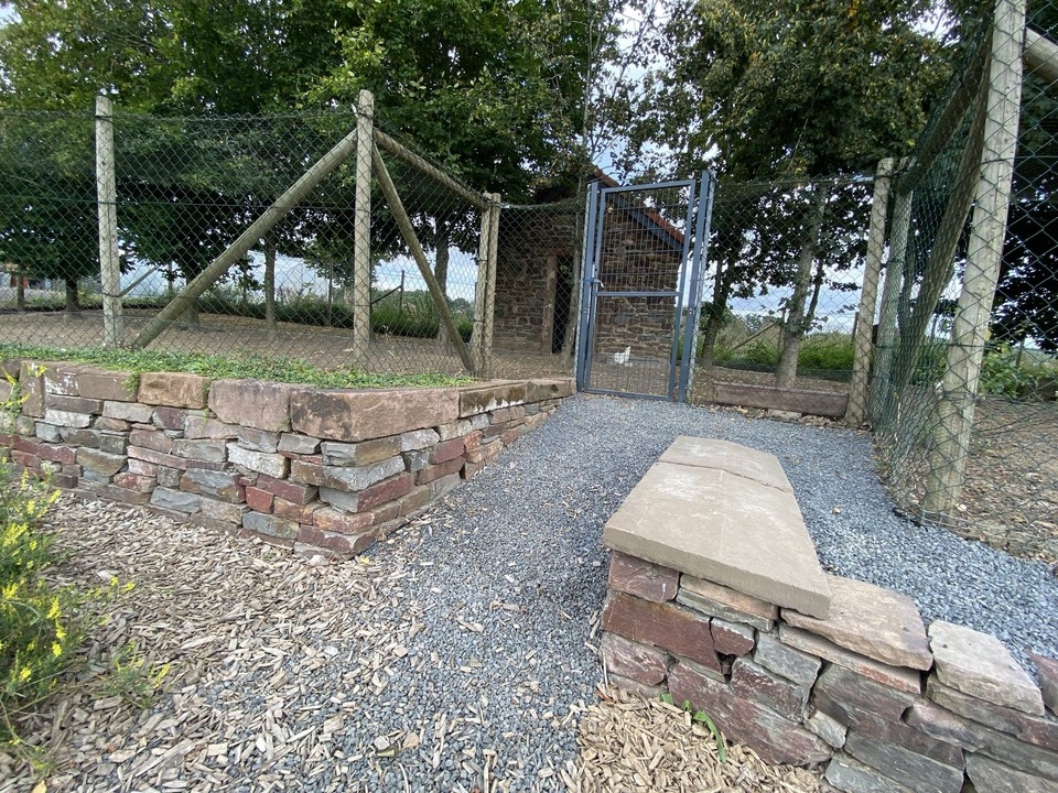 Het dak van de wintervaste stal (ca. 10,24 m2) is geïsoleerd en een deel van het kippenhok is beplant met bomen en struiken en een deel is open weide. Hier kunt u onder ideale omstandigheden kippen houden en uitkijken naar gezonde eieren van blije kippen.