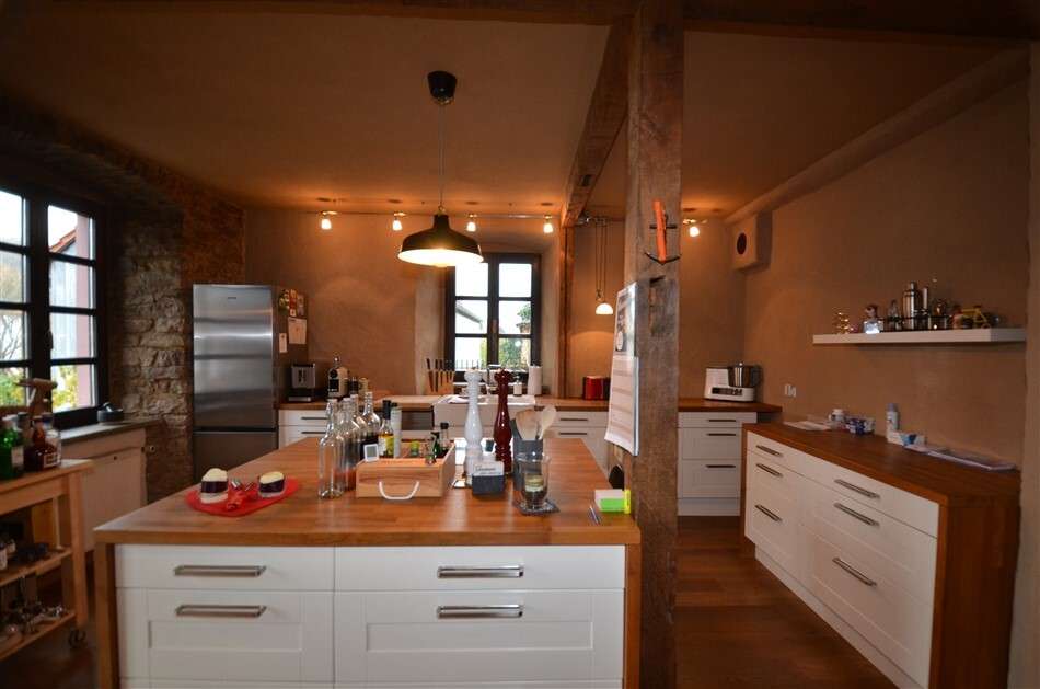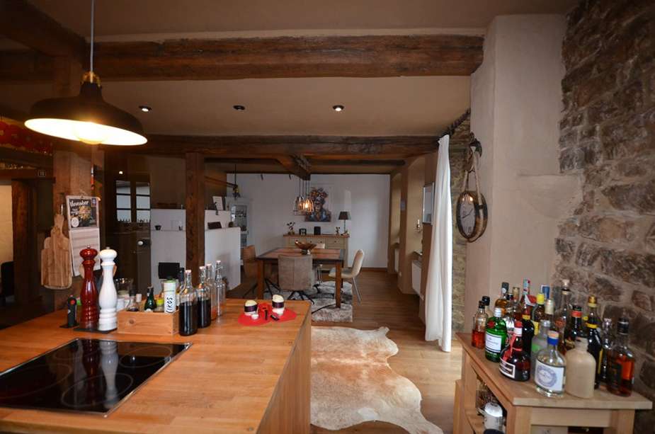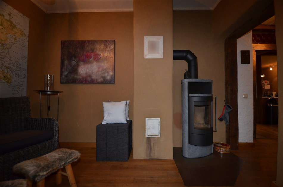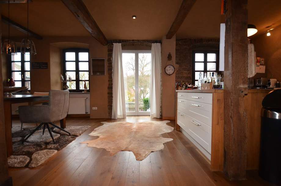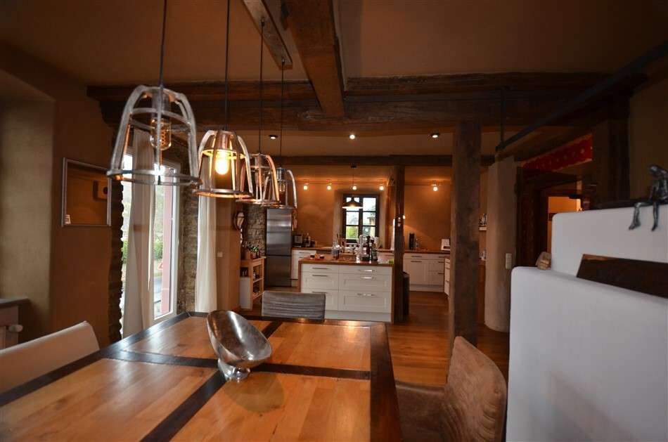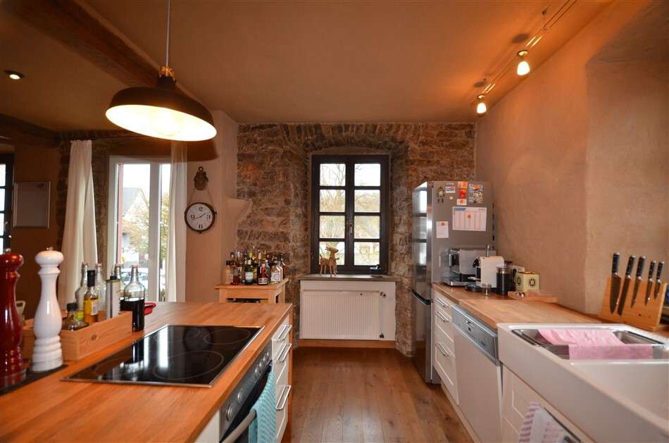 Das hier angebotene historische Landhaus wurde in den letzten Jahren liebevoll, aufwendig und modern renoviert. Das Haus wurde um 1841 erbaut. Weiterhin befindet sich auf dem Grundstück ein weiteres Haus welches zur Zeit als Ferienwohnung genutzt wird und eine entsprechende Rendite einbringt. Im Sockelgeschoss des Ferienhauses befinden sich zwei Garagen, sowie die Heiztechnik für beide Häuser. Das Landhaus wurde mit Bruchstein errichtet, dieser wurde im Innenraum teilweise freigelegt und bildet einen wunderschönen Kontrast zu den mit Lehm verputzten Wänden. Die ehemalige Raumaufteilung wurde geändert. Zwischenwände wurden entfernt. Dadurch wurde das Ständerwerk freigelegt und rundet mit den klassische Fliesen und Dielenböden den historischen Baustil des Hauses ab.