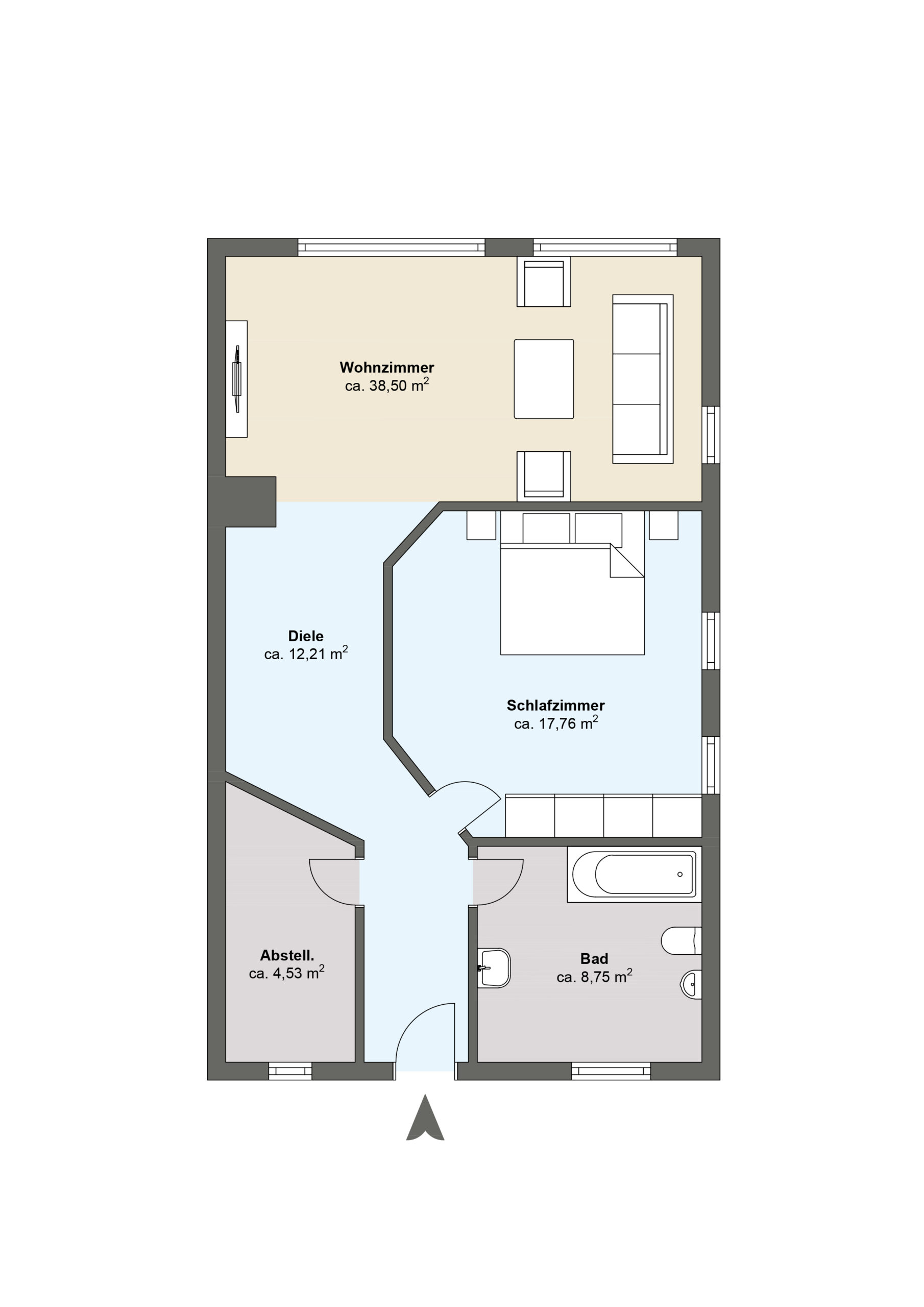 Hochparterre: Eingang, Flur, Abstellraum, Wohn-/ Essküche, Schlafzimmer, Bad.