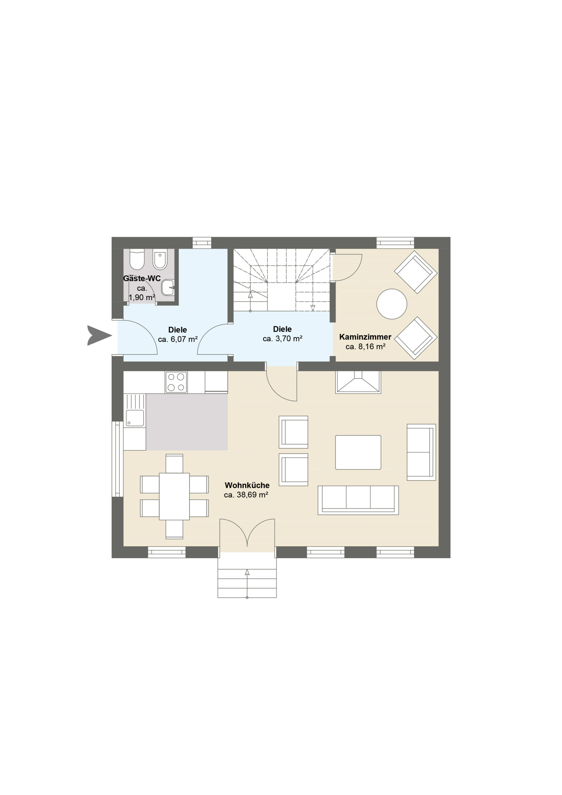 Erdgeschoss (Hochparterre): Eingang, Flur, Gäste WC, Kaminzimmer, Wohn/ Essküche mit Zugang zur Terrasse.