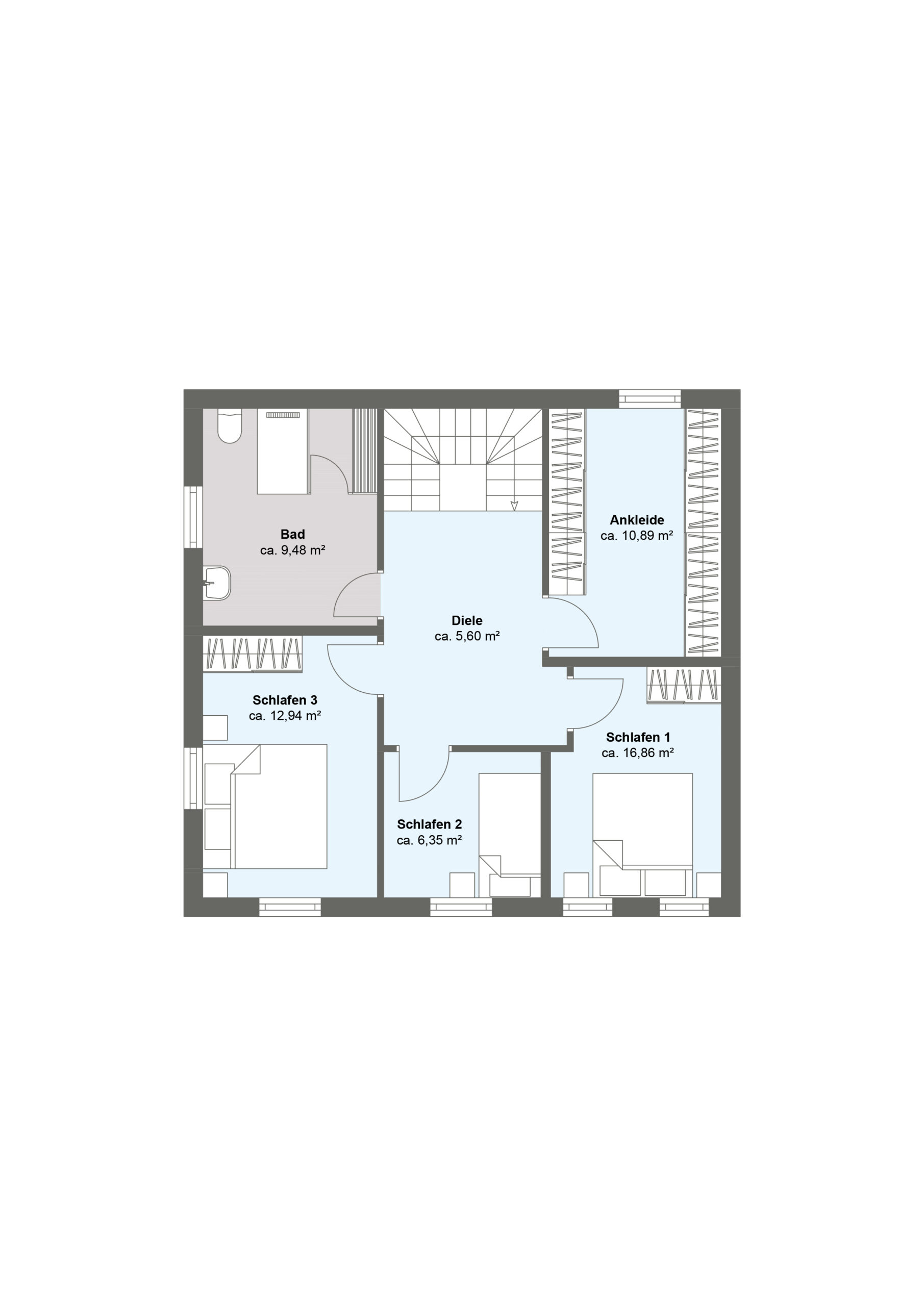 Obergeschoss: Flur, Bad, 3 Schlafzimmer, Ankleidezimmer