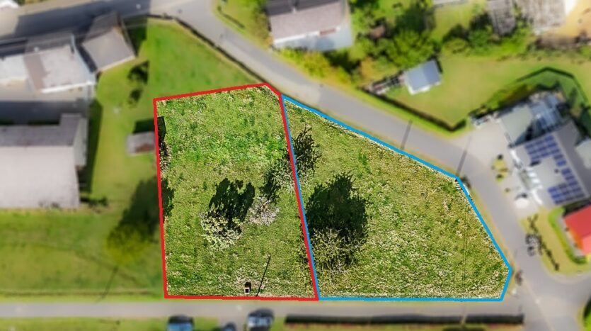 Optioneel is de rechter bouwgrond (blauw omlijnd) te koop voor € 74.000,00 (1.045 m²).