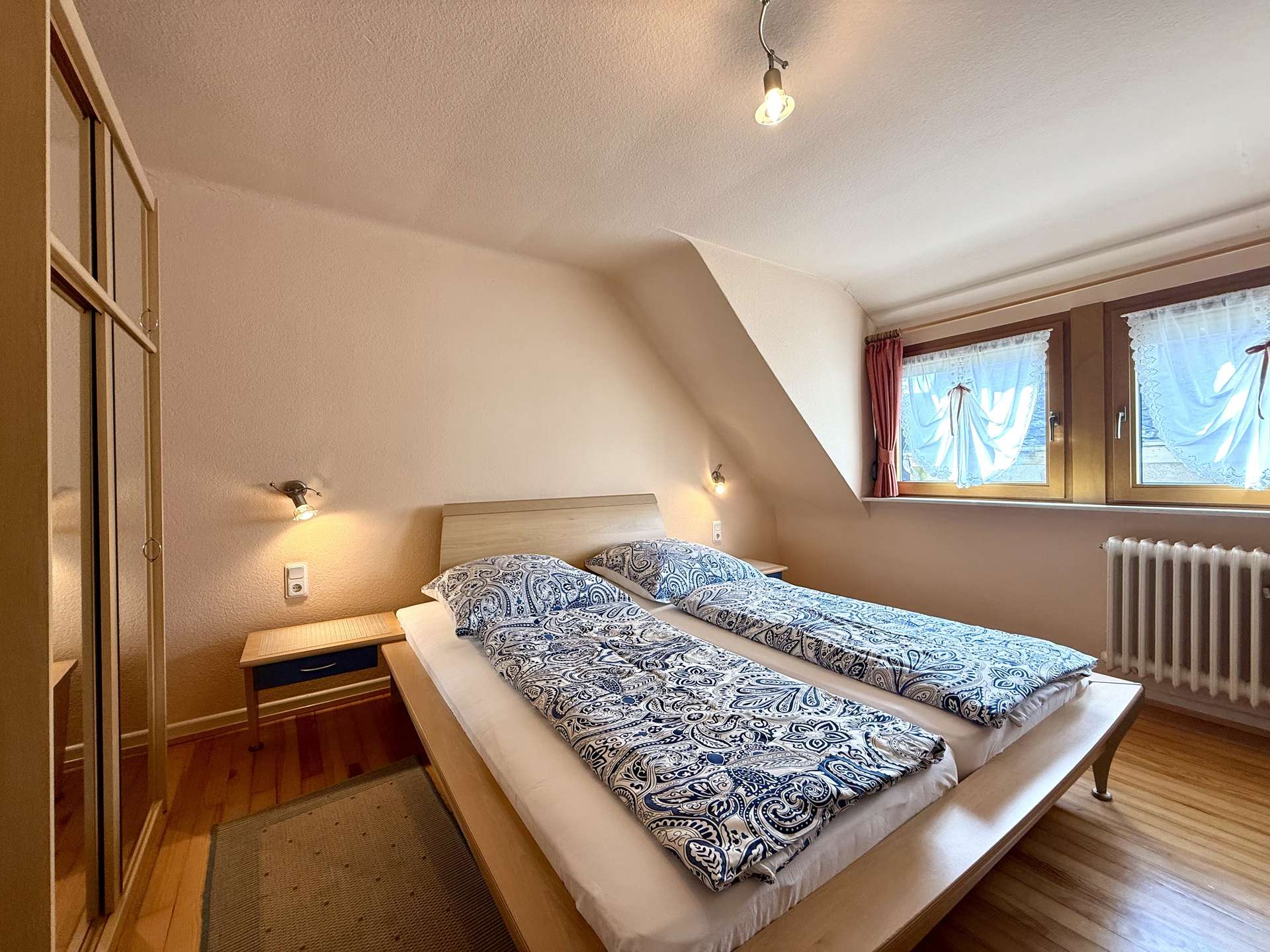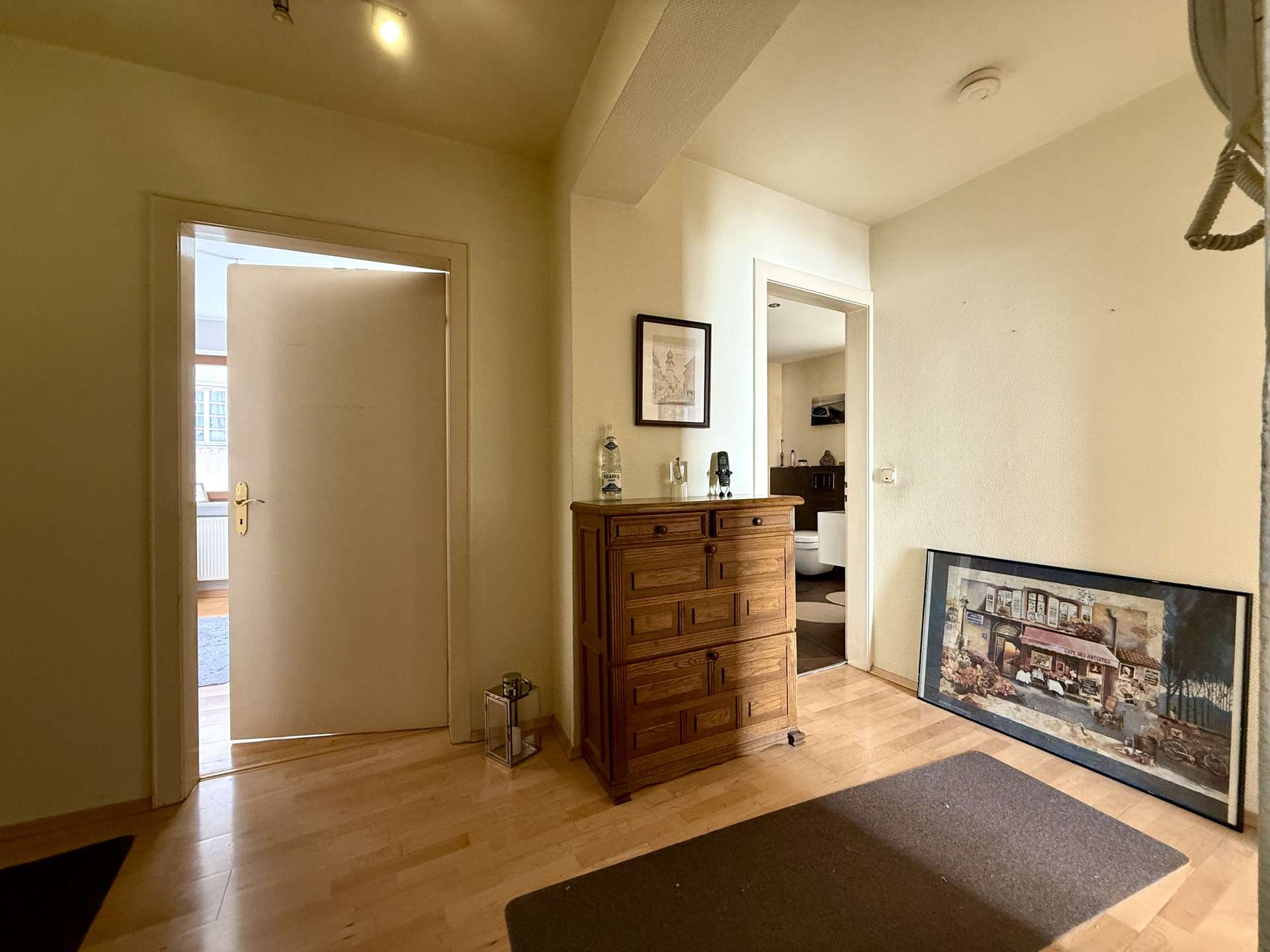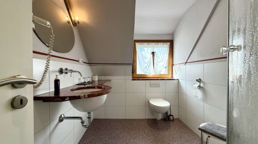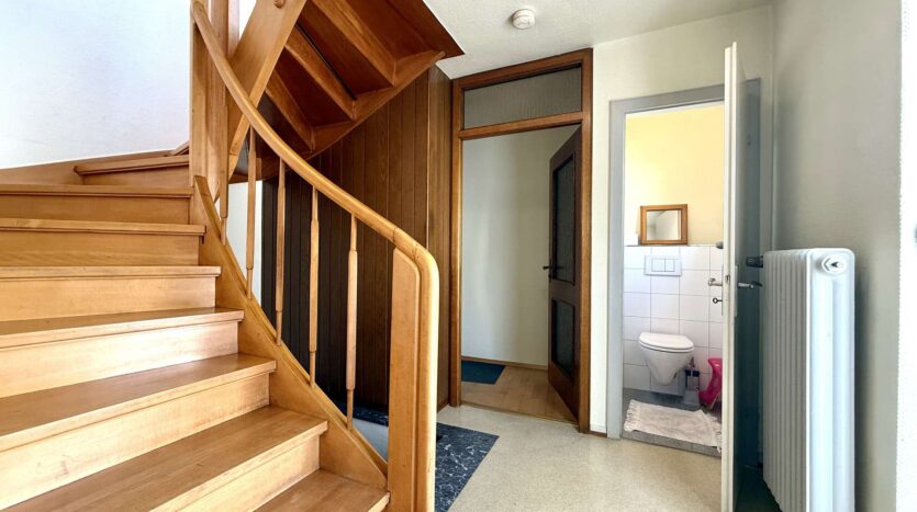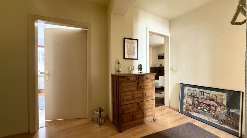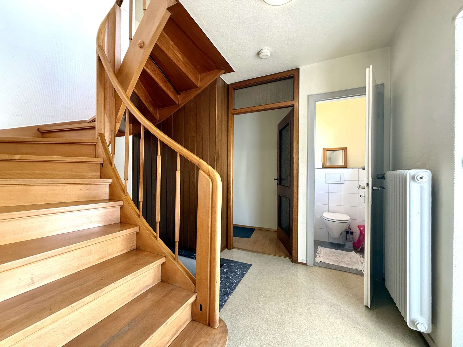 Das 1. Obergeschoss beherbergt eine geräumige Betreiberwohnung mit vier Zimmern, Bad und separater Toilette. Die Böden sind mit echtem Holzparkett ausgestattet, das dem Wohnbereich ein warmes Ambiente verleiht. Eine Marmorsteintreppe führt stilvoll in dieses Geschoss. Die Holzfenster (zweifach verglast, 1981) unterstreichen den klassischen Charme des Hauses. Neue Heizkörper (2012) sorgen für effiziente Wärme.