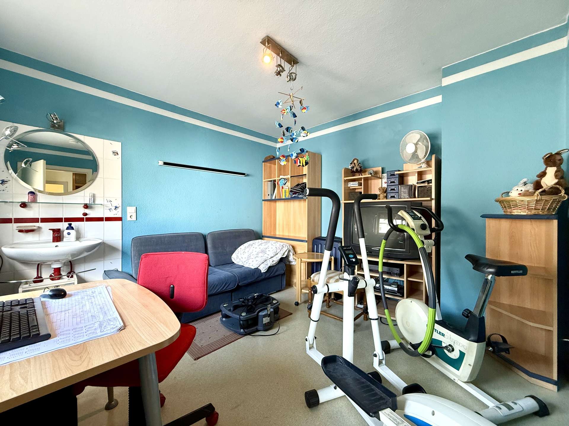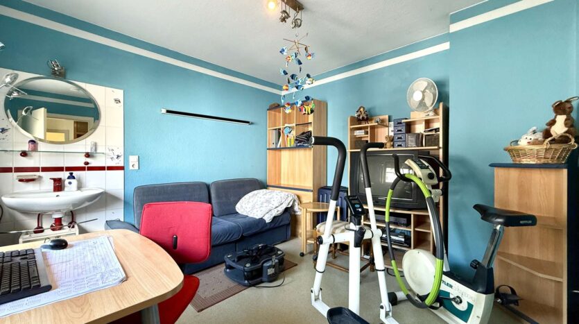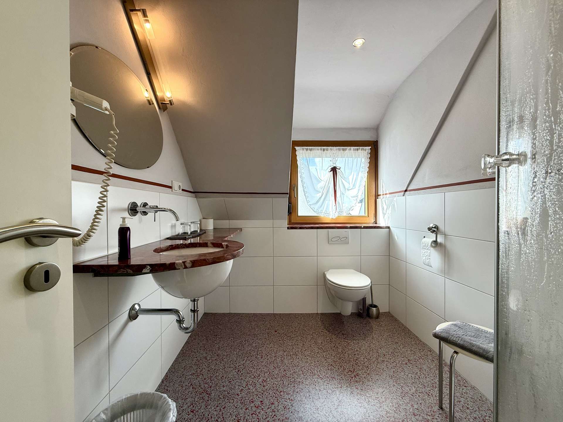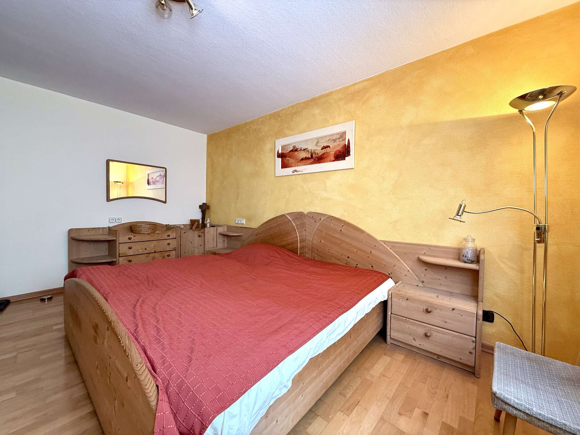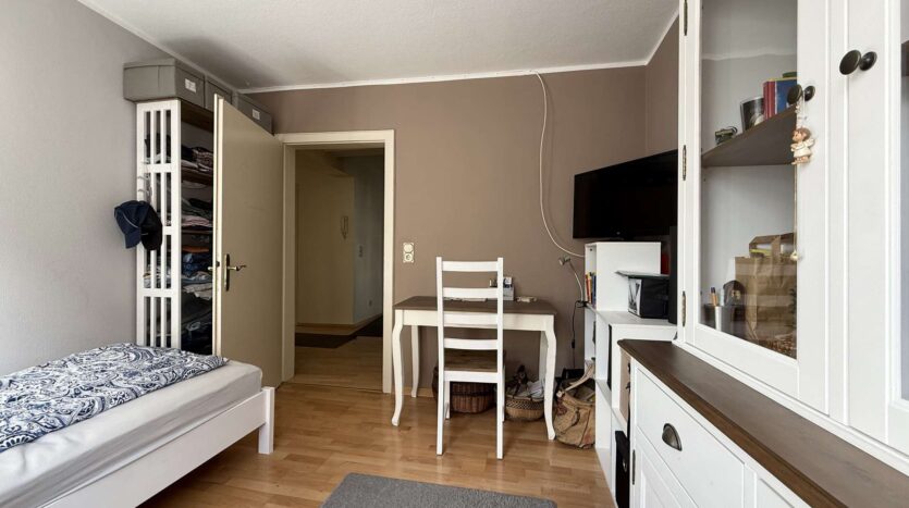 Das 1. Obergeschoss beherbergt eine geräumige Betreiberwohnung mit vier Zimmern, Bad und separater Toilette. Die Böden sind mit echtem Holzparkett ausgestattet, das dem Wohnbereich ein warmes Ambiente verleiht. Eine Marmorsteintreppe führt stilvoll in dieses Geschoss. Die Holzfenster (zweifach verglast, 1981) unterstreichen den klassischen Charme des Hauses. Neue Heizkörper (2012) sorgen für effiziente Wärme.