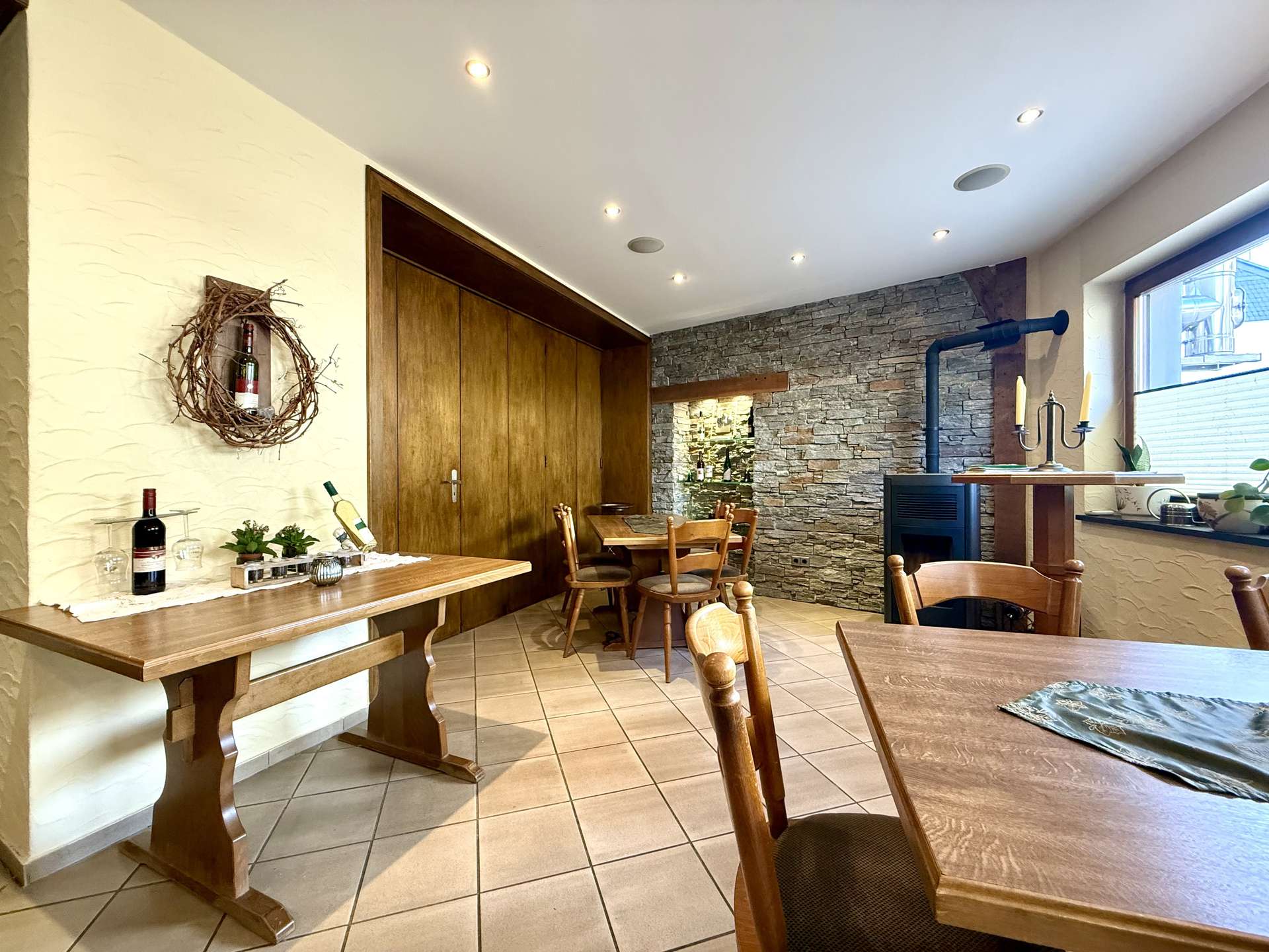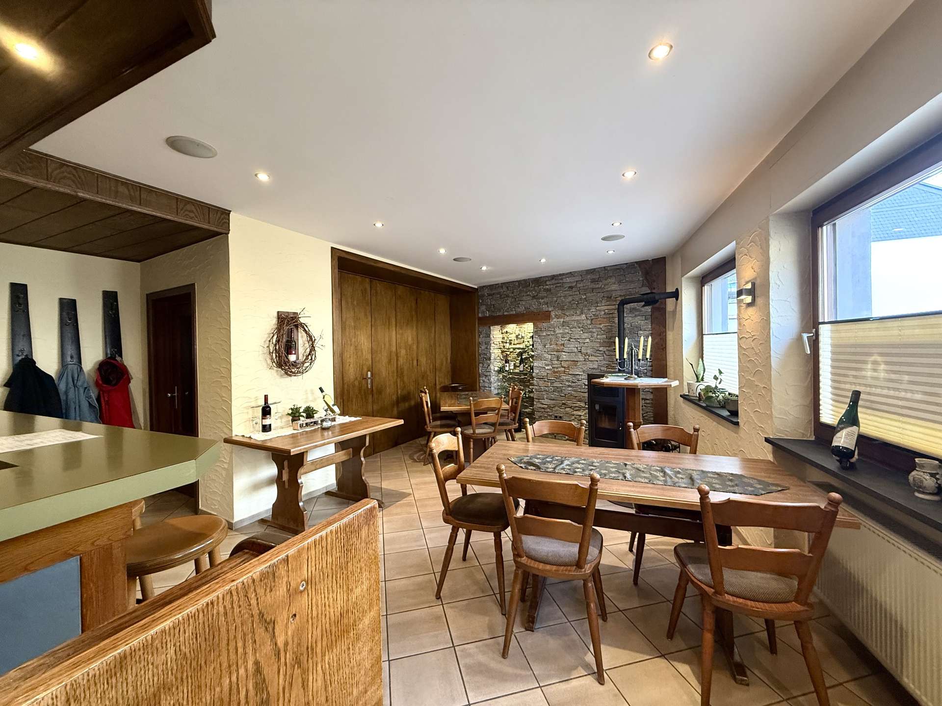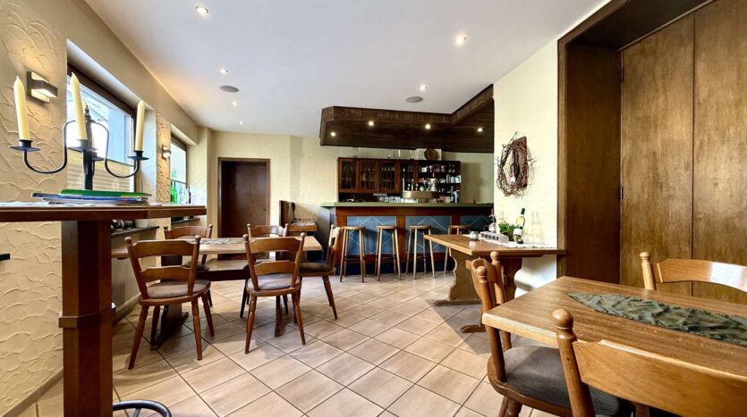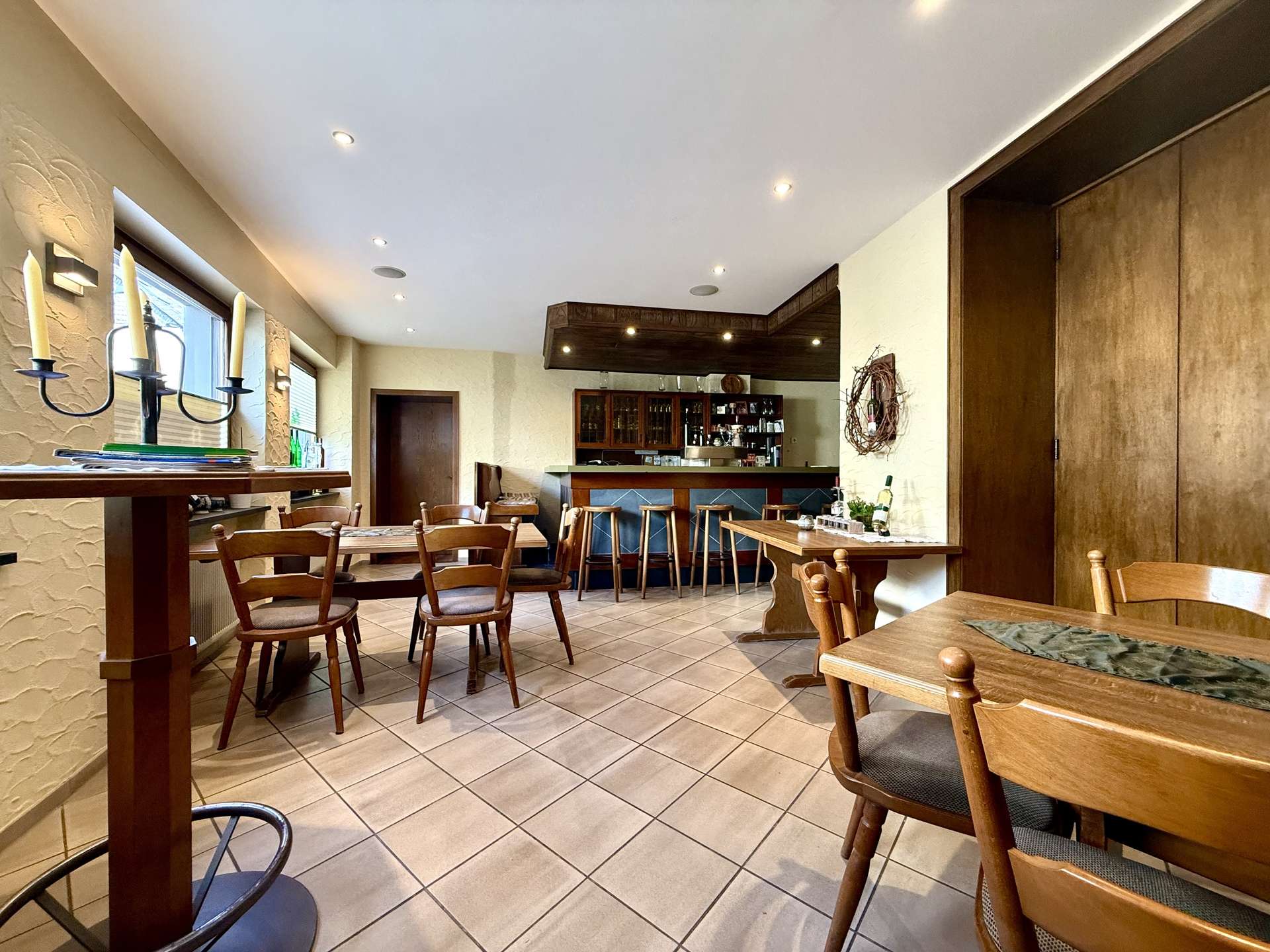 Im Erdgeschoss befindet sich eine gemütliche Gaststätte mit gefliestem Gastraum und separatem Frühstücksraum. Der Bereich bietet Platz für Stammgäste und Veranstaltungen gleichermaßen und ist funktional aufgeteilt. Elektrische Rollläden mit Fernbedienung sorgen hier für zusätzlichen Komfort.