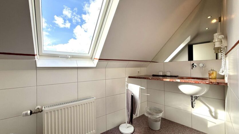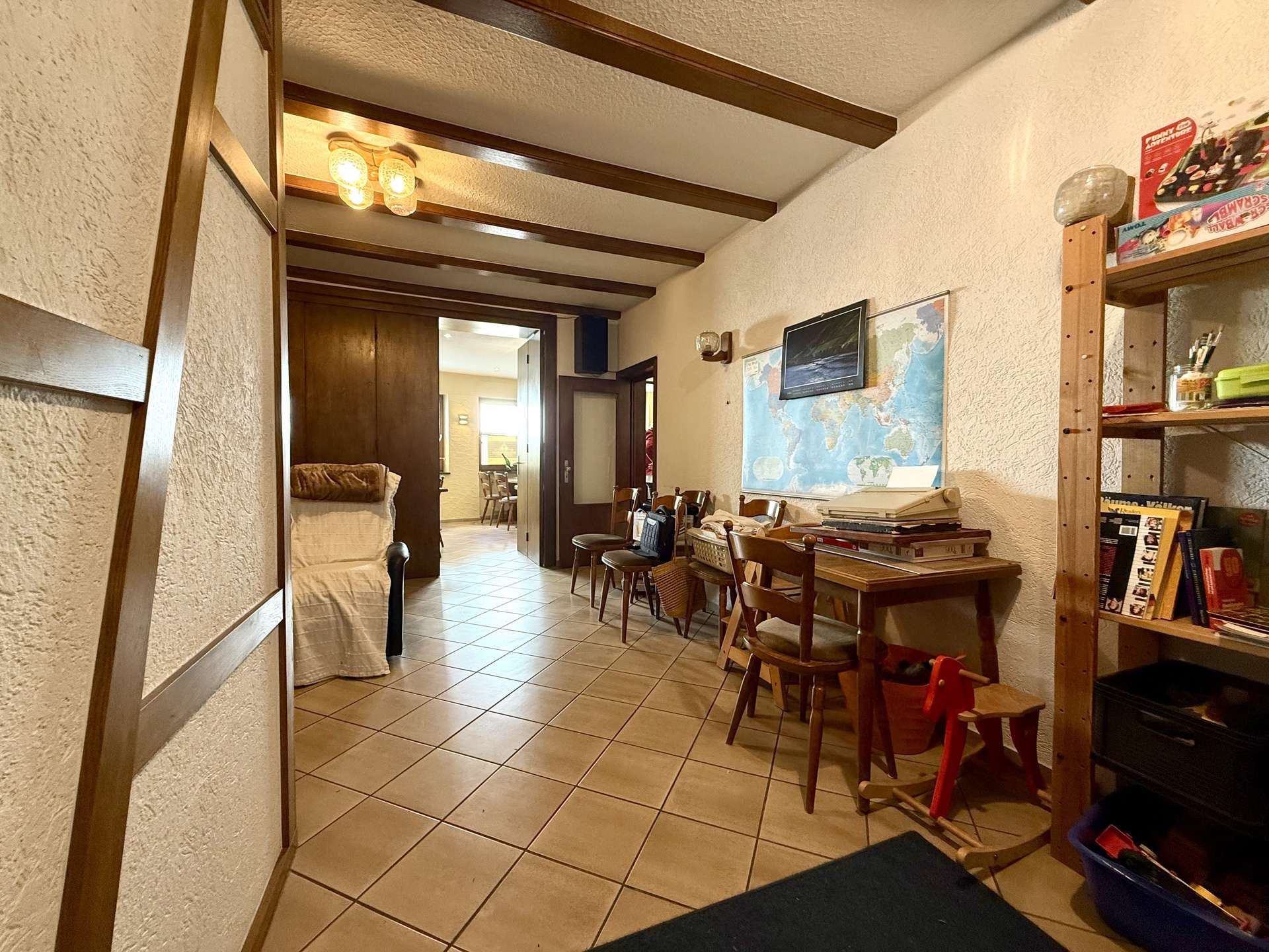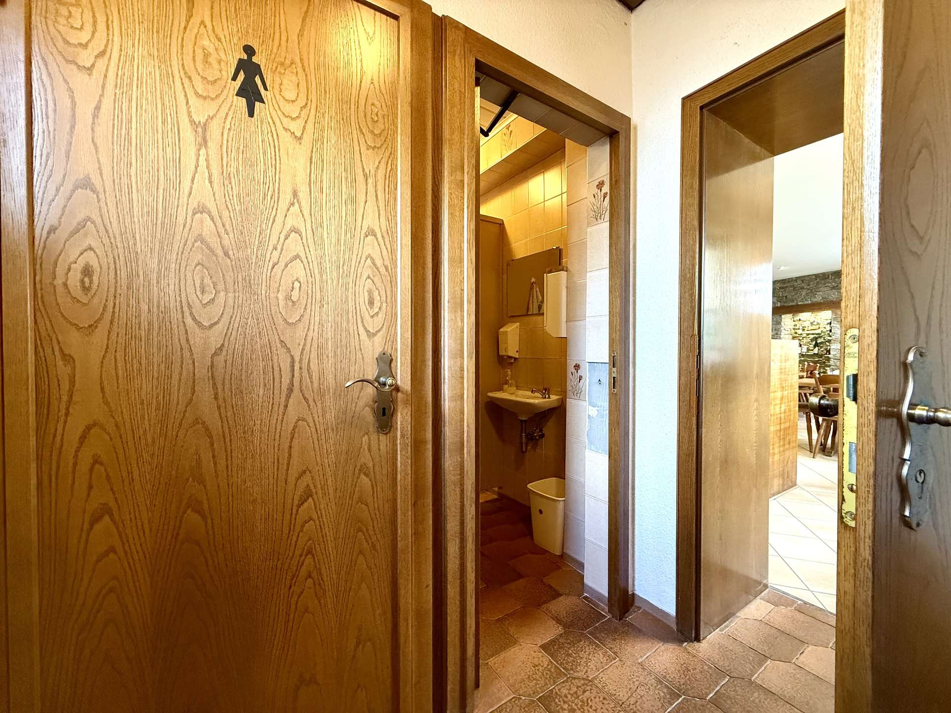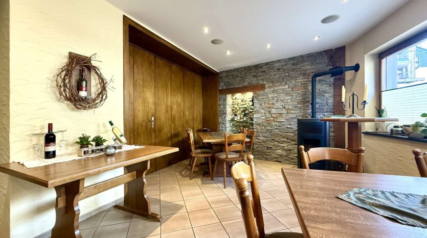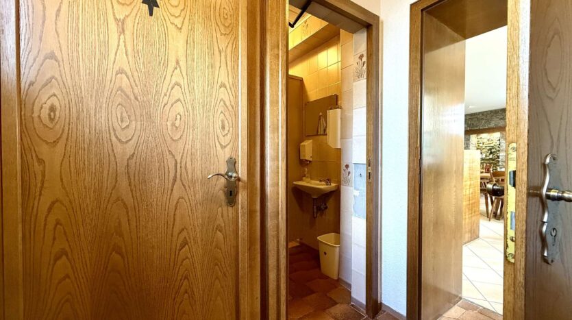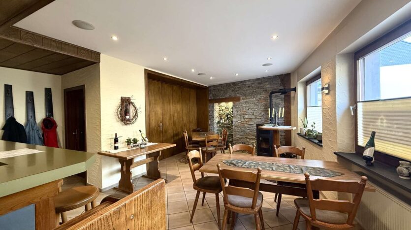Im Erdgeschoss befindet sich eine gemütliche Gaststätte mit gefliestem Gastraum und separatem Frühstücksraum. Der Bereich bietet Platz für Stammgäste und Veranstaltungen gleichermaßen und ist funktional aufgeteilt. Elektrische Rollläden mit Fernbedienung sorgen hier für zusätzlichen Komfort.