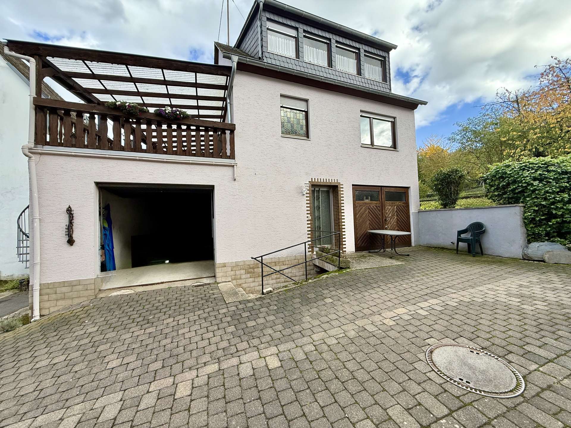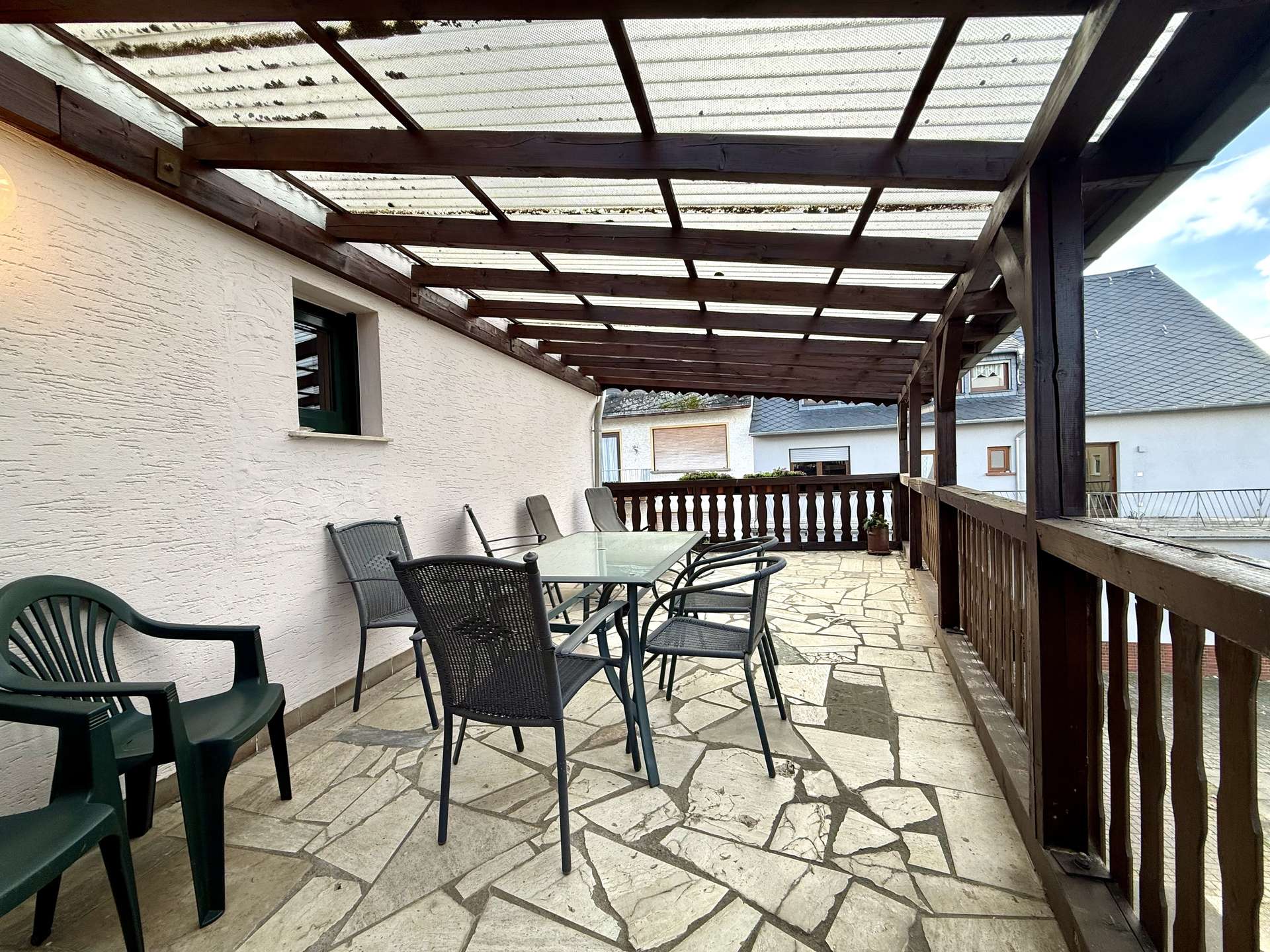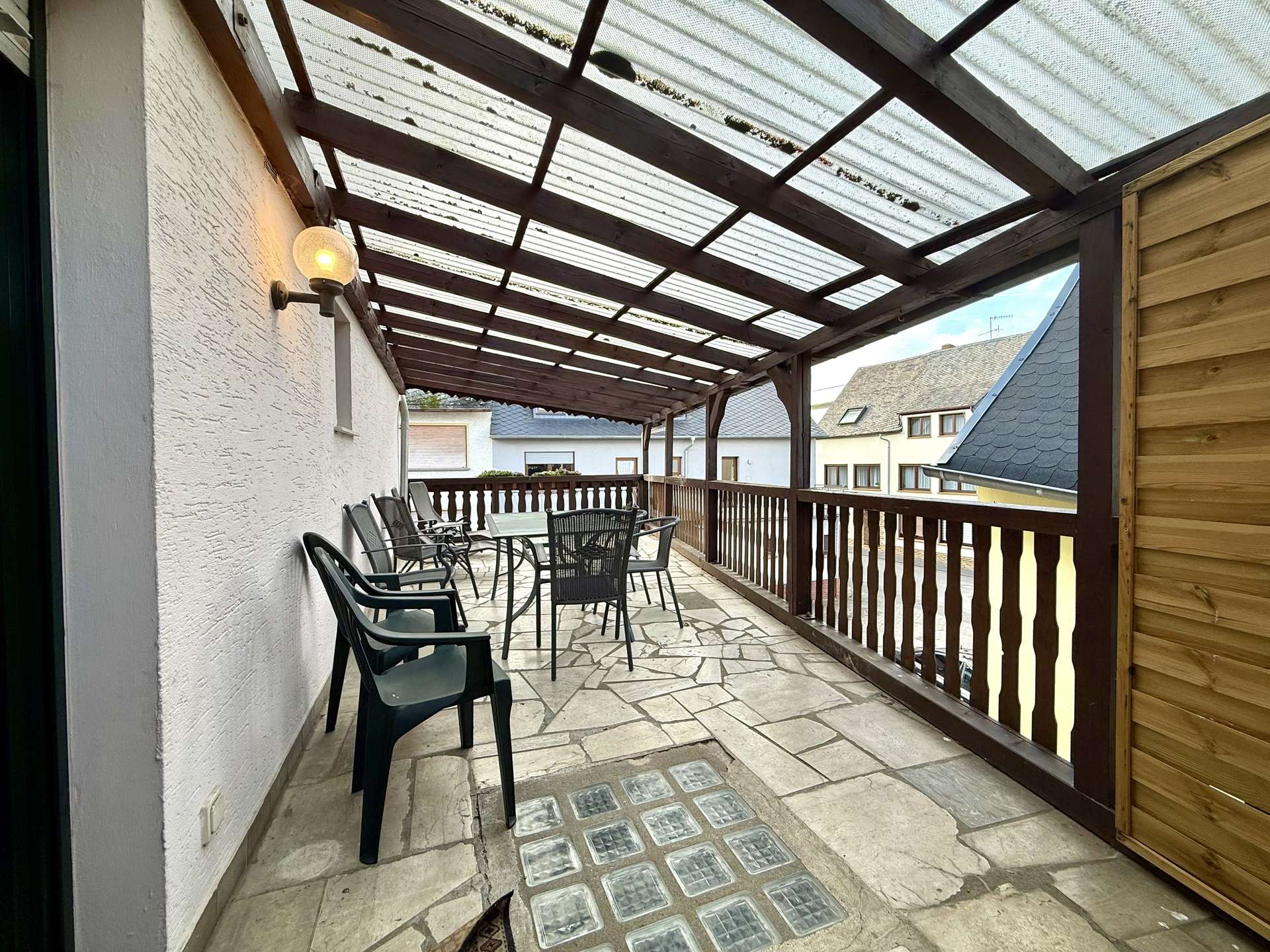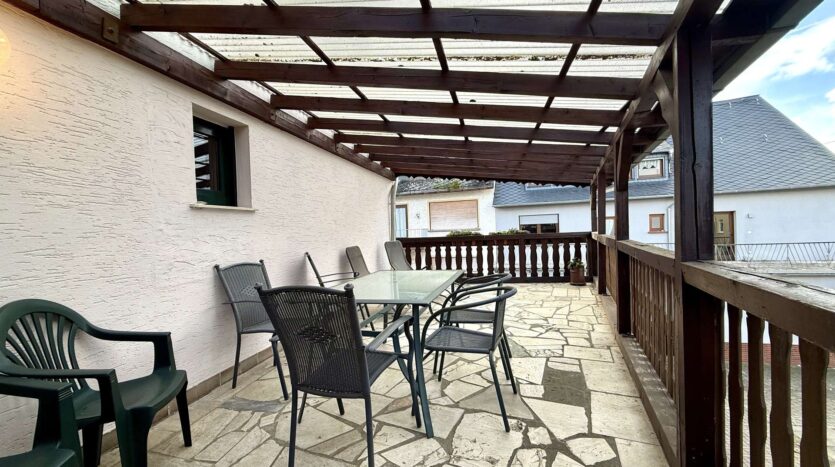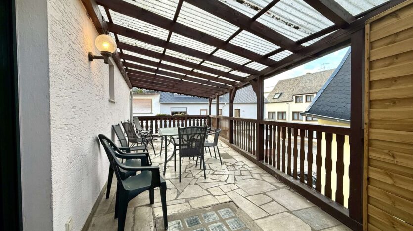 Besonderes Highlight ist der große, geflieste und überdachte Balkon, der einen geschützten Außenbereich bietet. Ein weiterer Balkon auf der Rückseite des Hauses schafft zusätzliche Rückzugsmöglichkeiten.