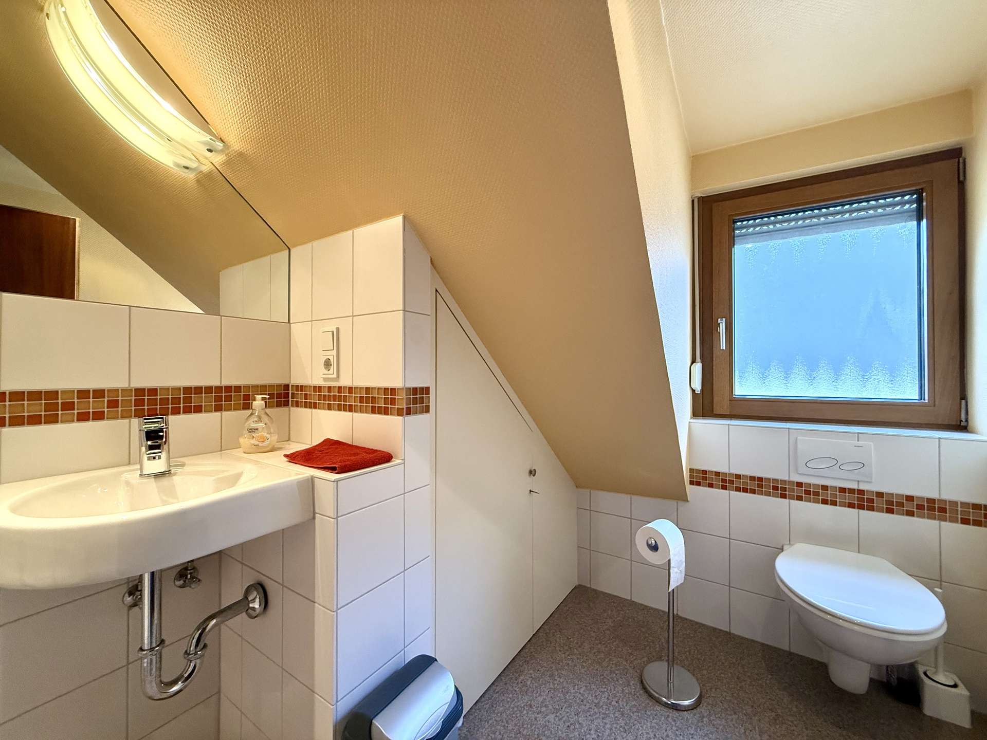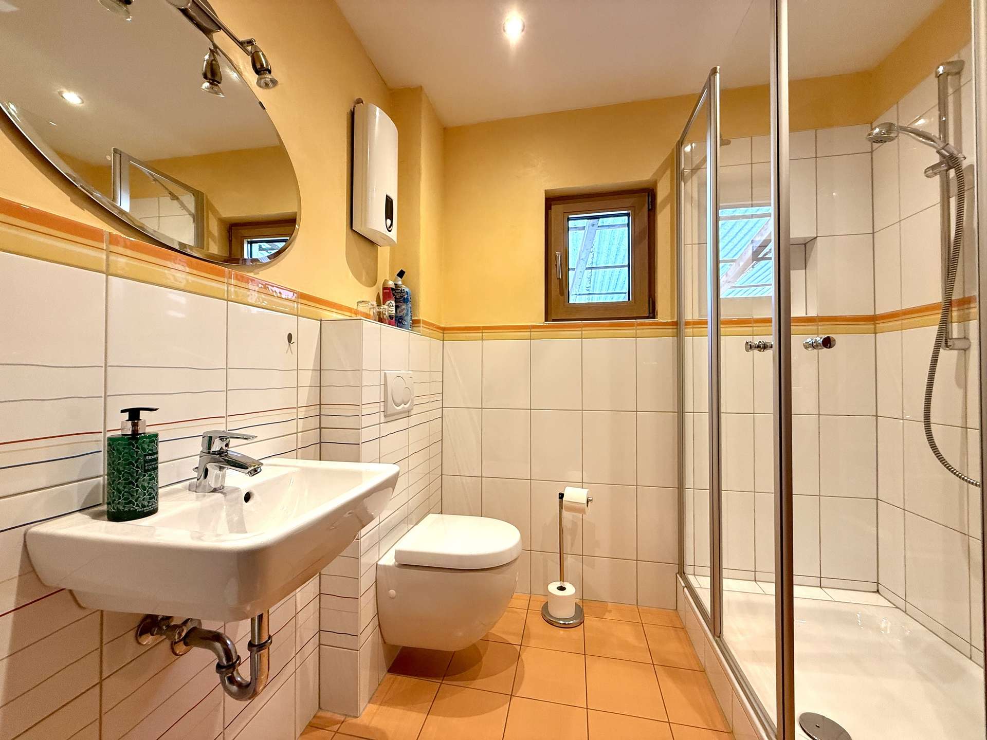 Im Innenbereich sorgen Marmor-, Fliesen- und Teppichböden für ein angenehmes Wohnambiente. Das Tageslichtbad mit Dusche ist gepflegt und funktional gestaltet.