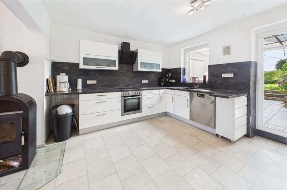 Die Böden präsentieren sich je nach Bereich in Fliesen, Dielen oder Laminat und verleihen den Räumen einen abwechslungsreichen Charakter. Eine Einbauküche ist bereits vorhanden und macht den Einzug unkompliziert. Der gemütliche Kamin sorgt für behagliche Abende, während das Gäste-WC für zusätzlichen Komfort im Alltag sorgt. Abgerundet wird das Angebot durch einen Keller sowie einen praktischen Abstellraum, die ausreichend Stauraum bieten.