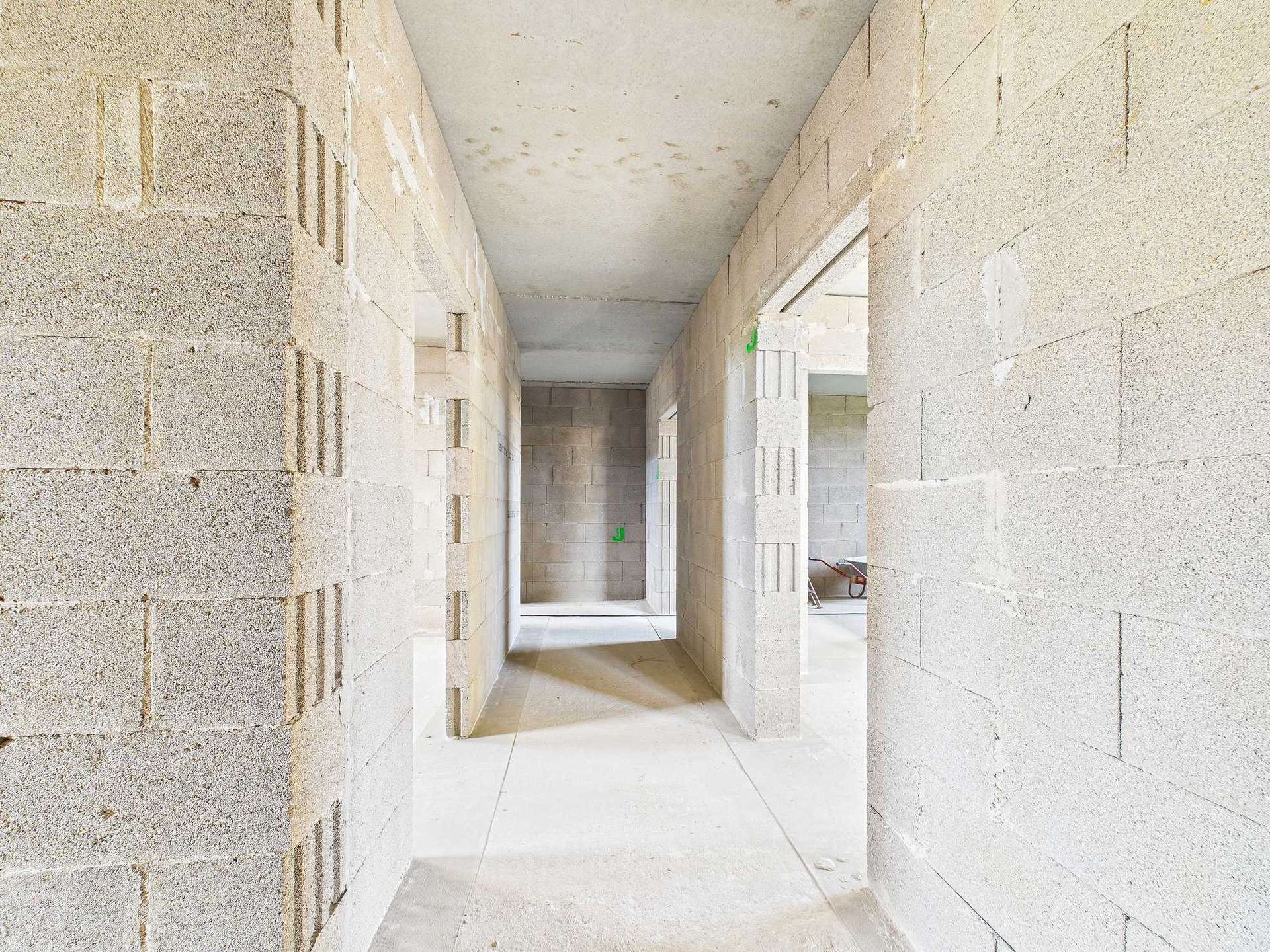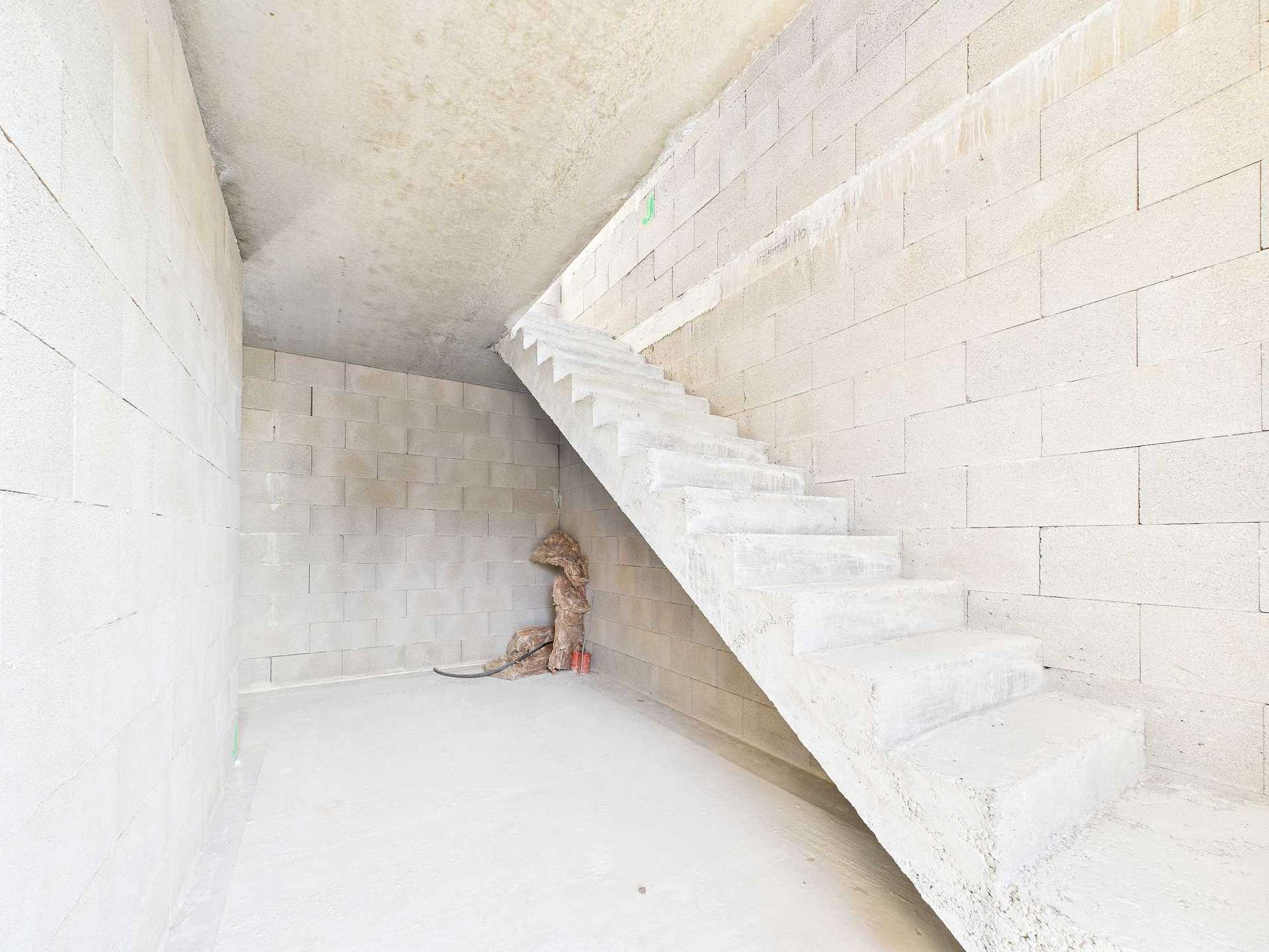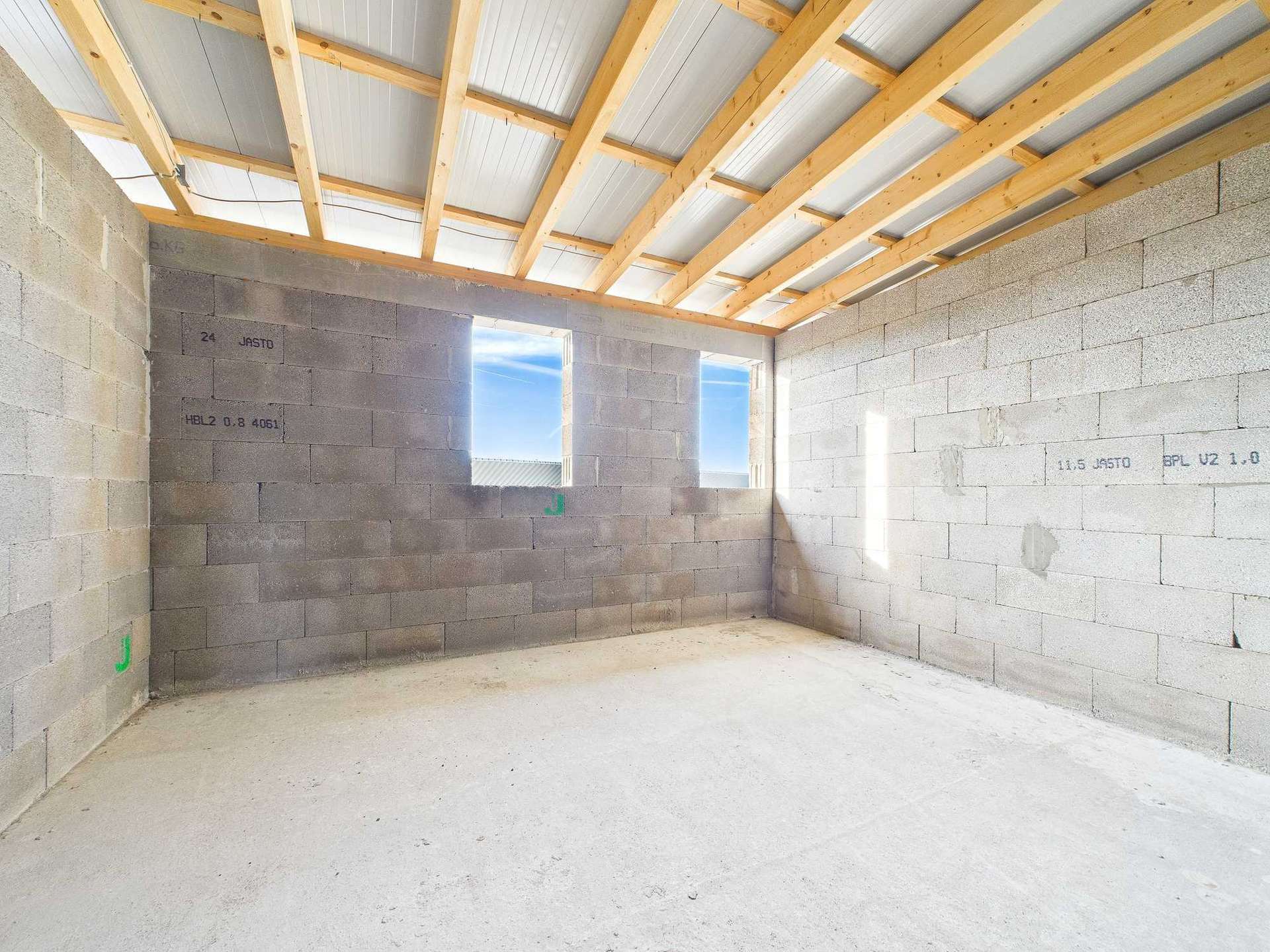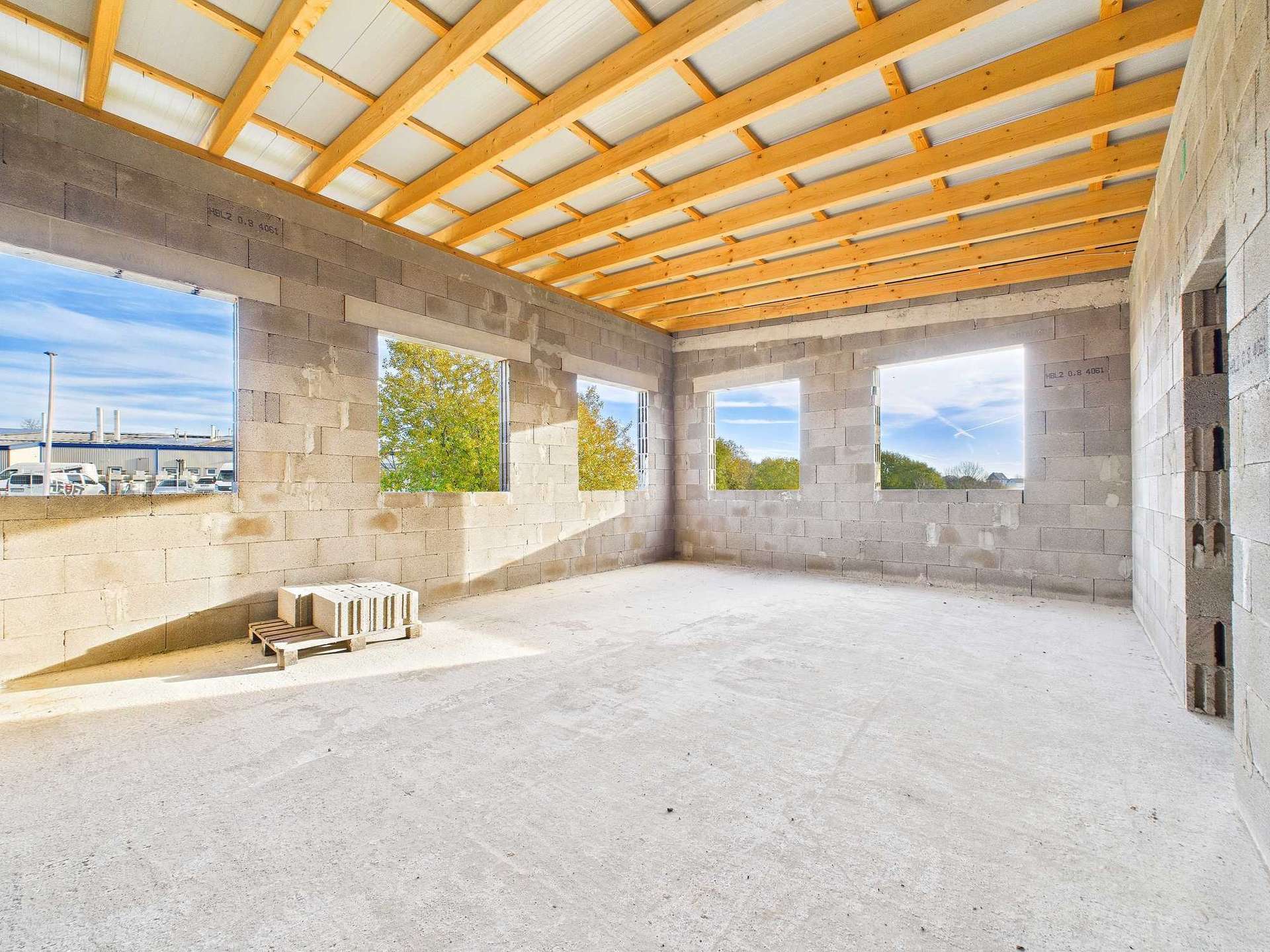 Das Bürogebäude ist ein Rohbau mit Dach. Fenster und sämtliche Installationen sind noch nicht vorhanden.