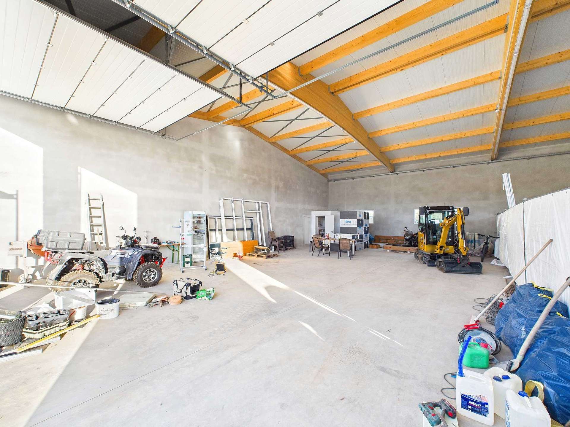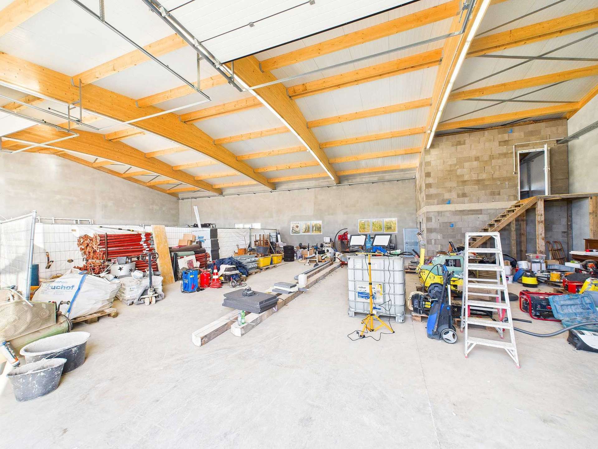 Ausgestattet ist die Halle mit vier Toren, die jeweils rund 4 Meter breit und ca. 4,50 Meter hoch sind. Dies ermöglicht eine komfortable Zufahrt sowie das Ein- und Auslagern auch größerer Fahrzeuge und Maschinen. Der Boden besteht aus einer hochbelastbaren Stahlfaserbodenplatte, die für anspruchsvolle Nutzungen ausgelegt ist. Innerhalb der Halle stehen zudem zwei sanitär ausgestattete WC-Bereiche sowie ein abgetrennter Büroraum zur Verfügung.