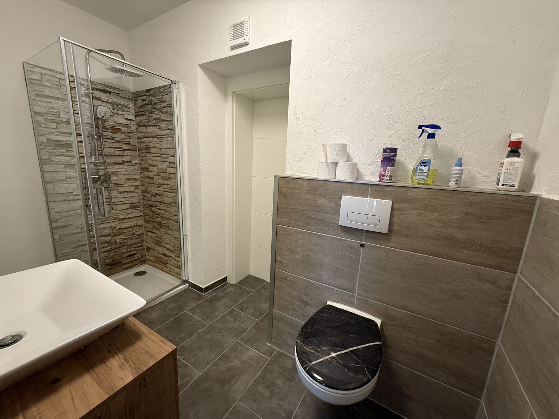 Modernisiertes Badezimmer mit Dusche, Waschbecken, Toilette und Waschmaschinenanschluss