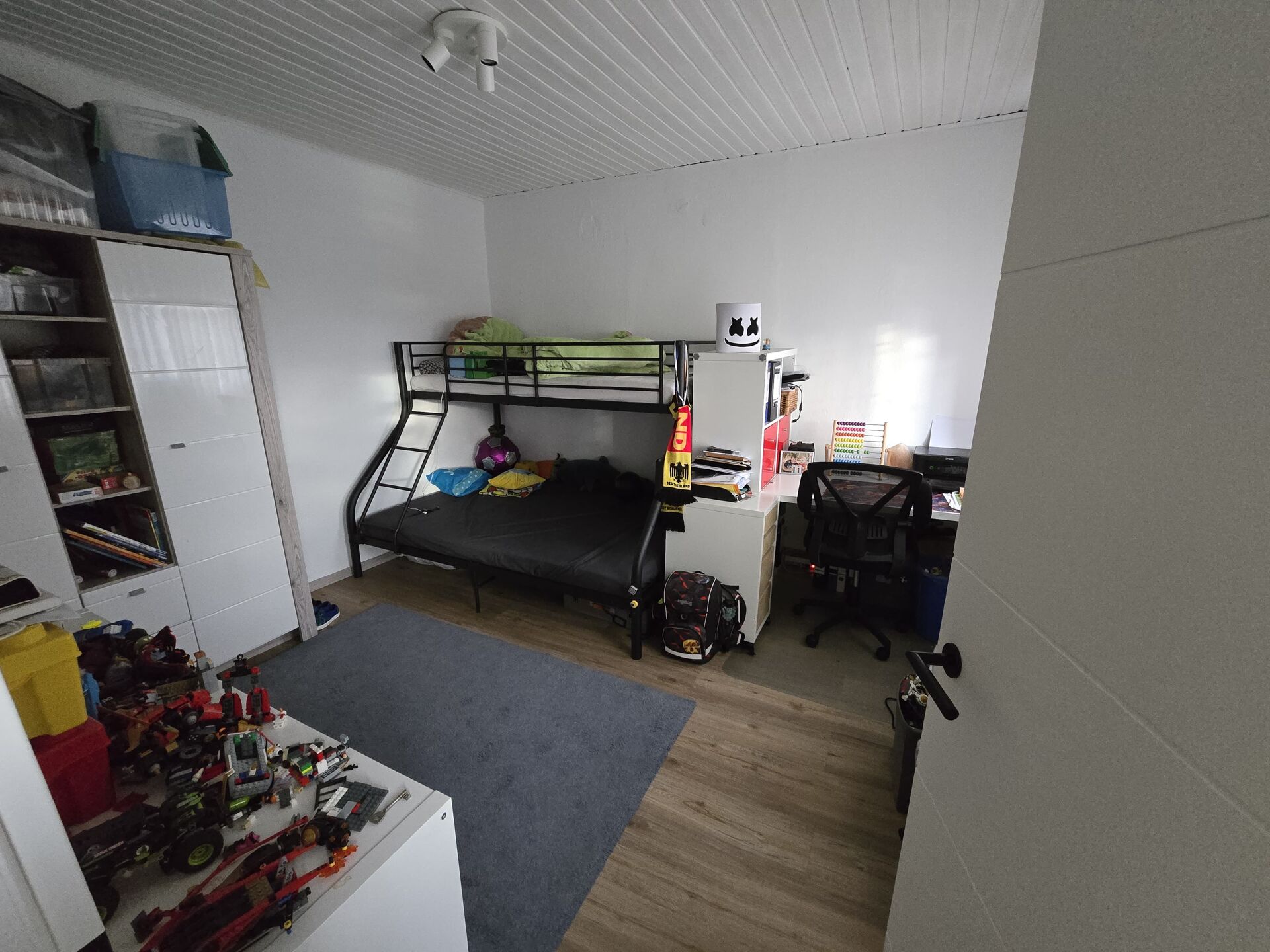 Im ersten Obergeschoss stehen ein Kinderzimmer, ein Schlafzimmer sowie ein modern gestaltetes Badezimmer zur Verfügung. Das Badezimmer wurde vollständig erneuert und ist mit einer Dusche, einem Waschbecken, einer Toilette sowie einem Waschmaschinenanschluss ausgestattet. Besonders praktisch ist der Zugang sowohl vom Flur als auch direkt vom Elternschlafzimmer aus.