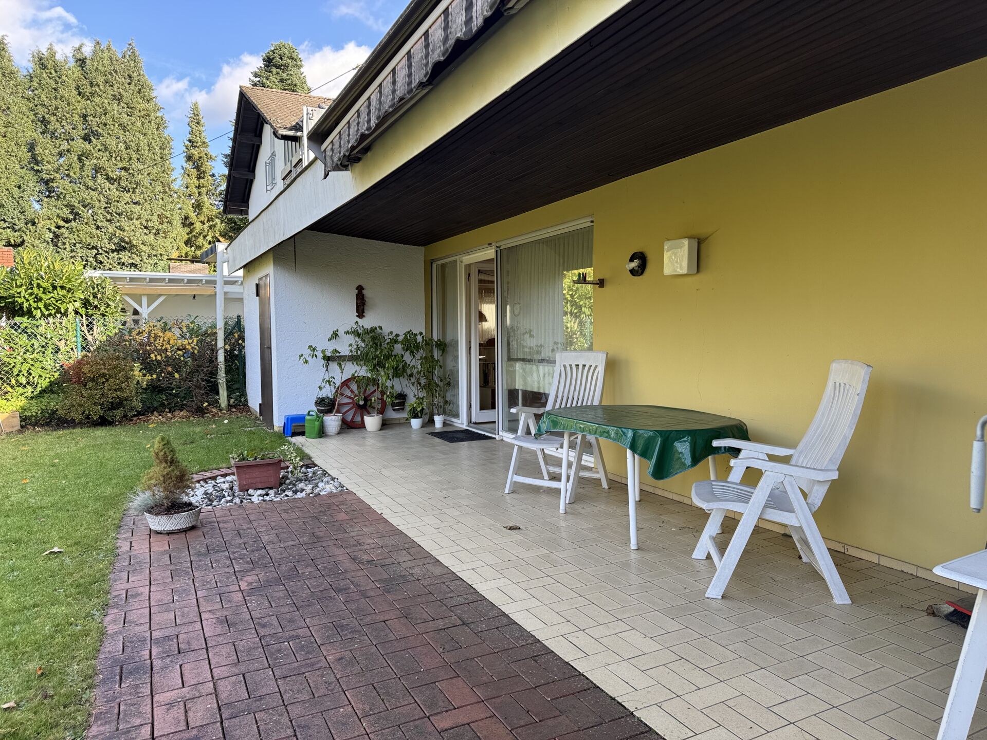 Vom Wohnzimmer aus gelangen Sie über die Terrasse in den sonnigen und wunderschönen Garten– ein Ort zum Entspannen, Essen im Freien oder geselligen Beisammensein.
