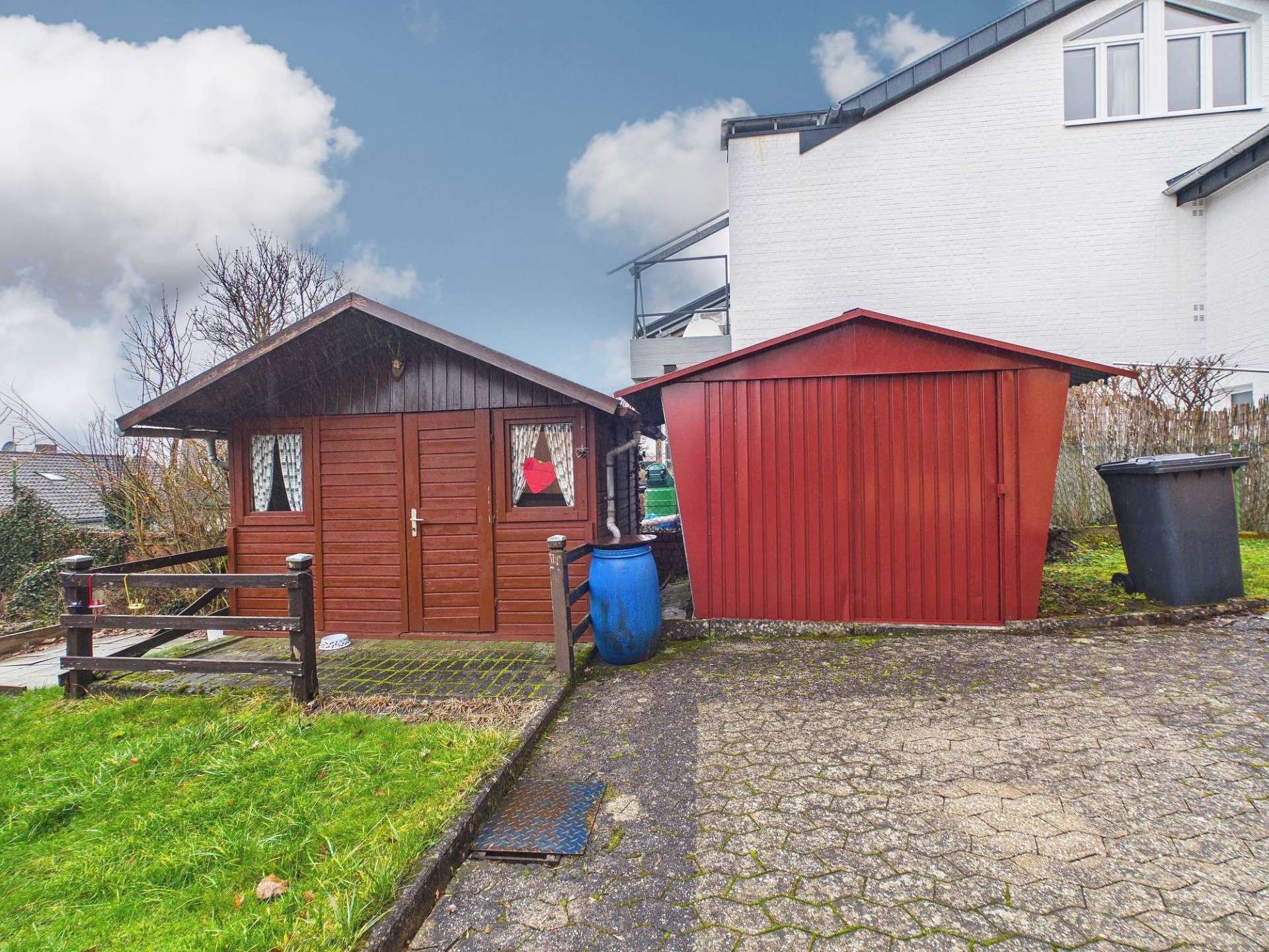 Der Garten verfügt über eine Terrasse, eine Rasenfläche, ein Gerätehäuschen sowie ein Gartenhaus und bietet ausreichend Platz für Freizeit, Erholung und Familienleben.