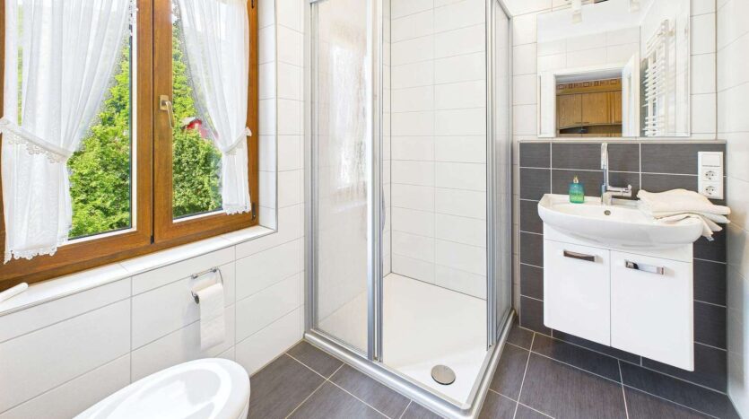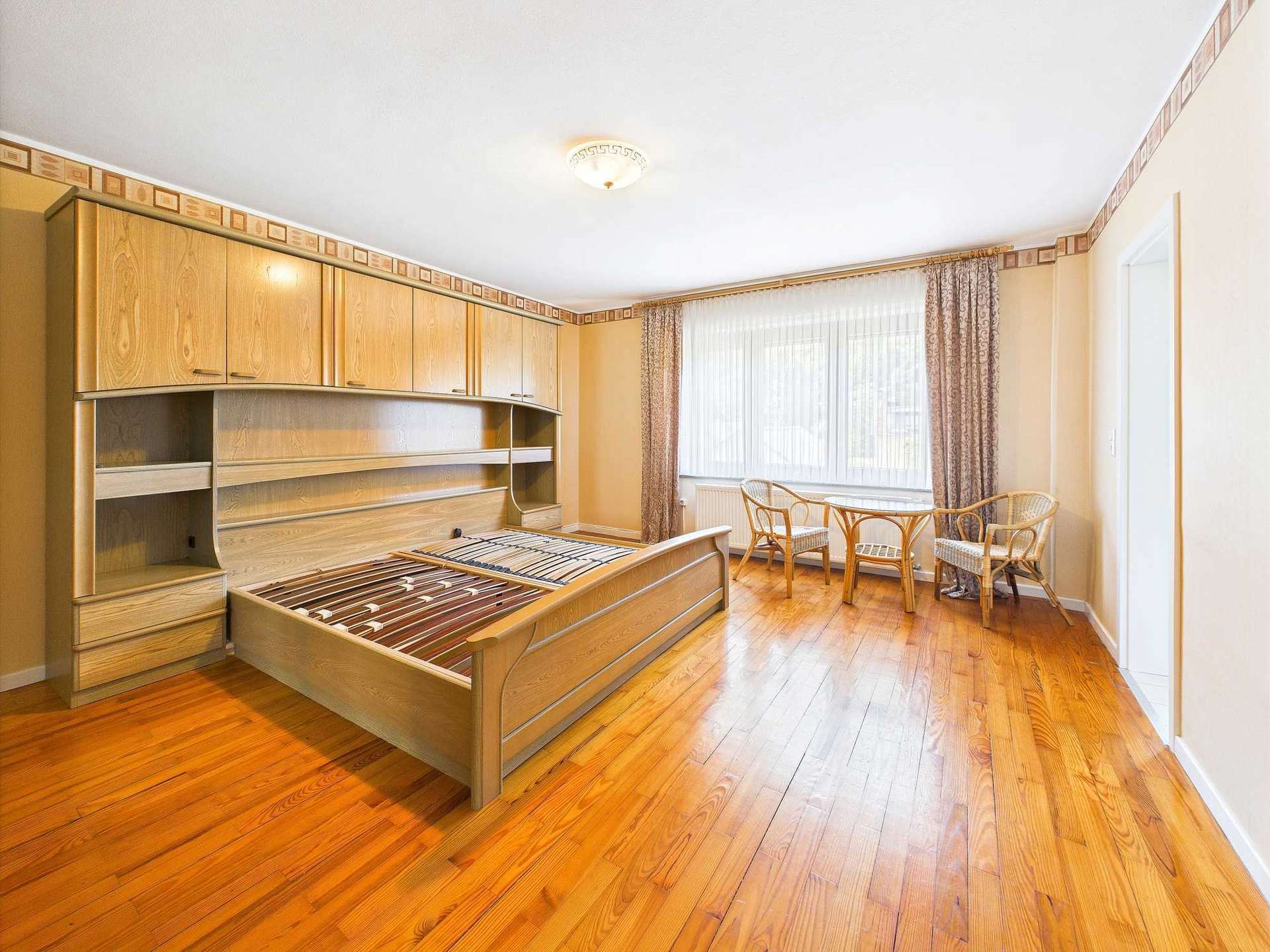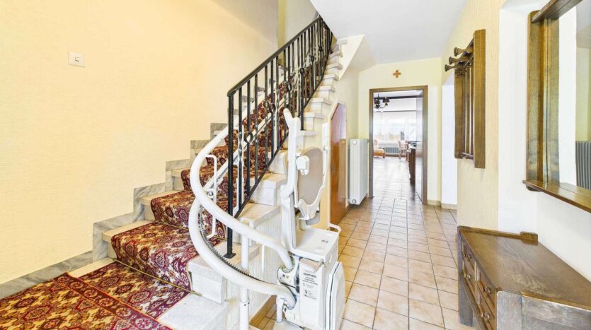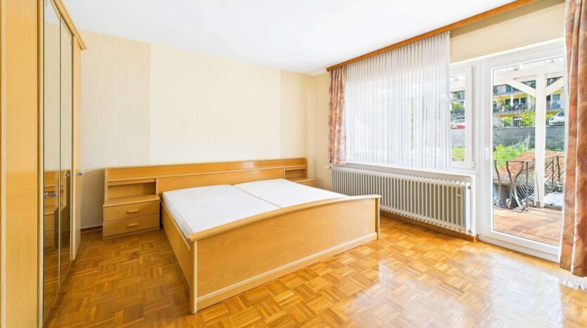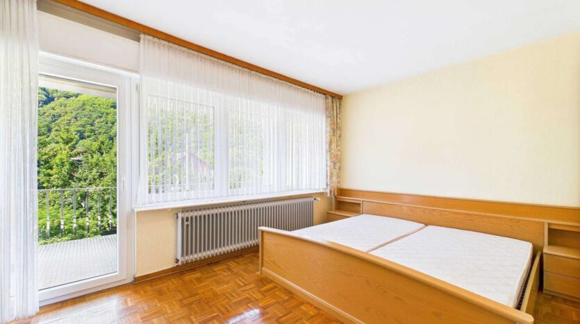 Im ersten Obergeschoss befinden sich insgesamt fünf Schlafzimmer. Drei davon verfügen über integrierte Duschbäder – zwei aus den 1980er Jahren, eines modernisiert und mit Tageslicht. Zwei weitere Zimmer sind mit Waschbecken ausgestattet. Eine große Terrasse auf der Rückseite sowie eine Loggia zur Straßenseite bieten zusätzlichen Freiraum und schöne Ausblicke.