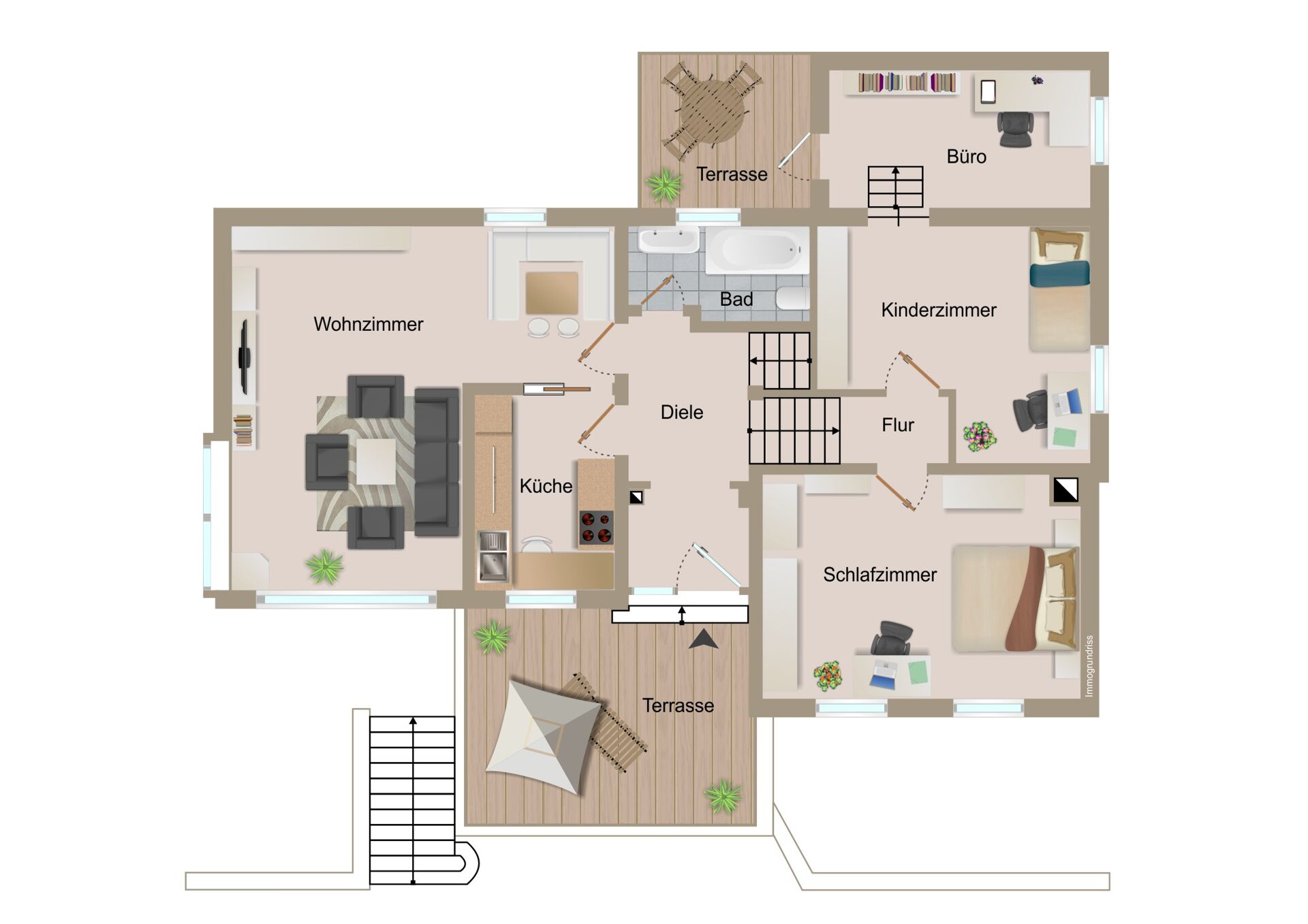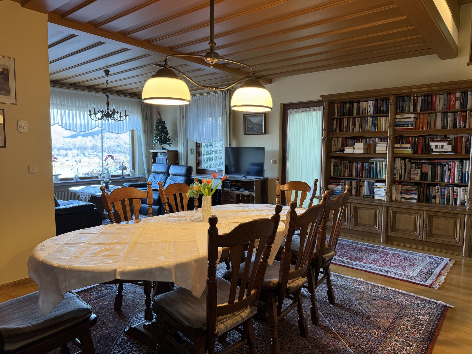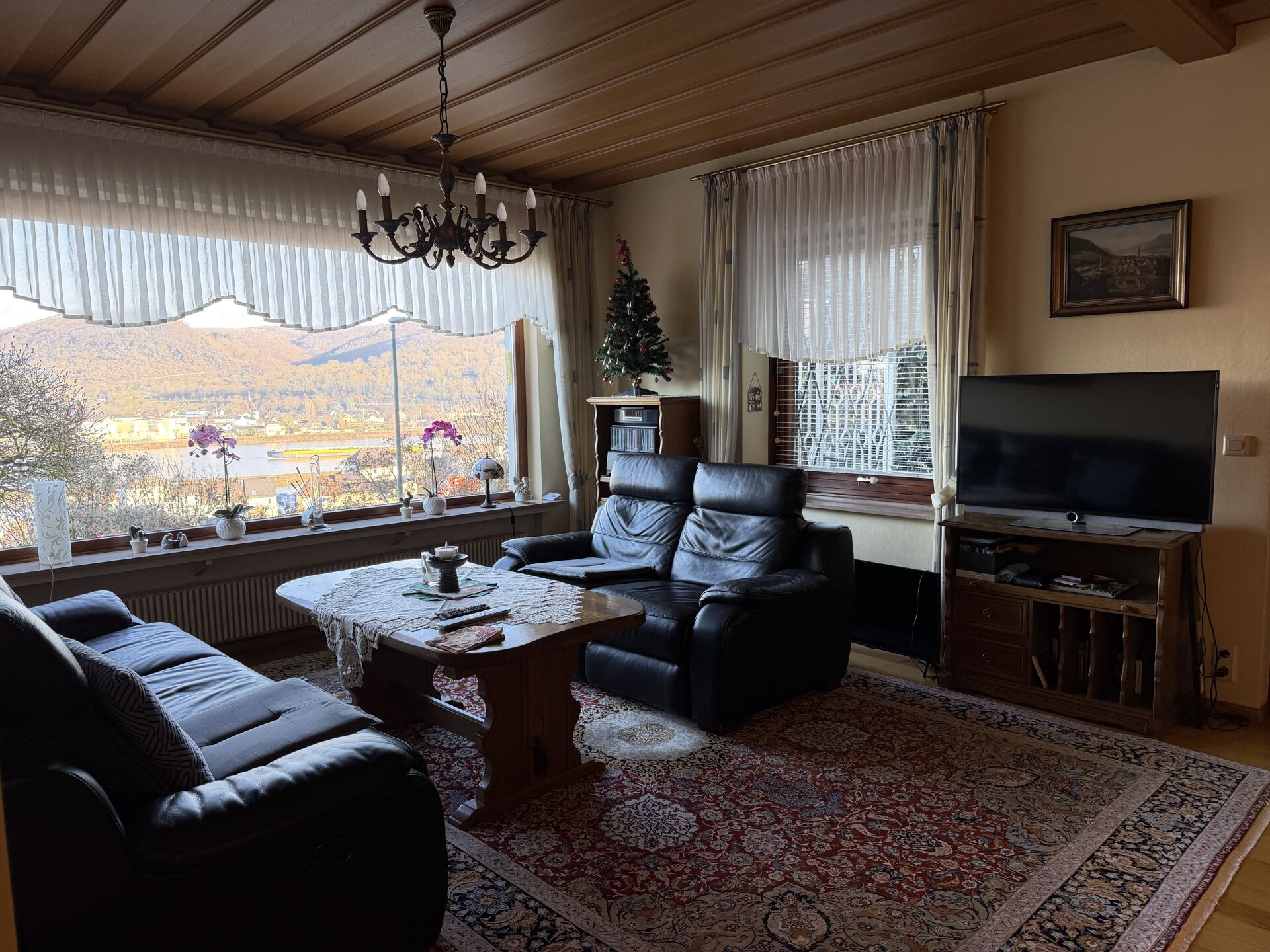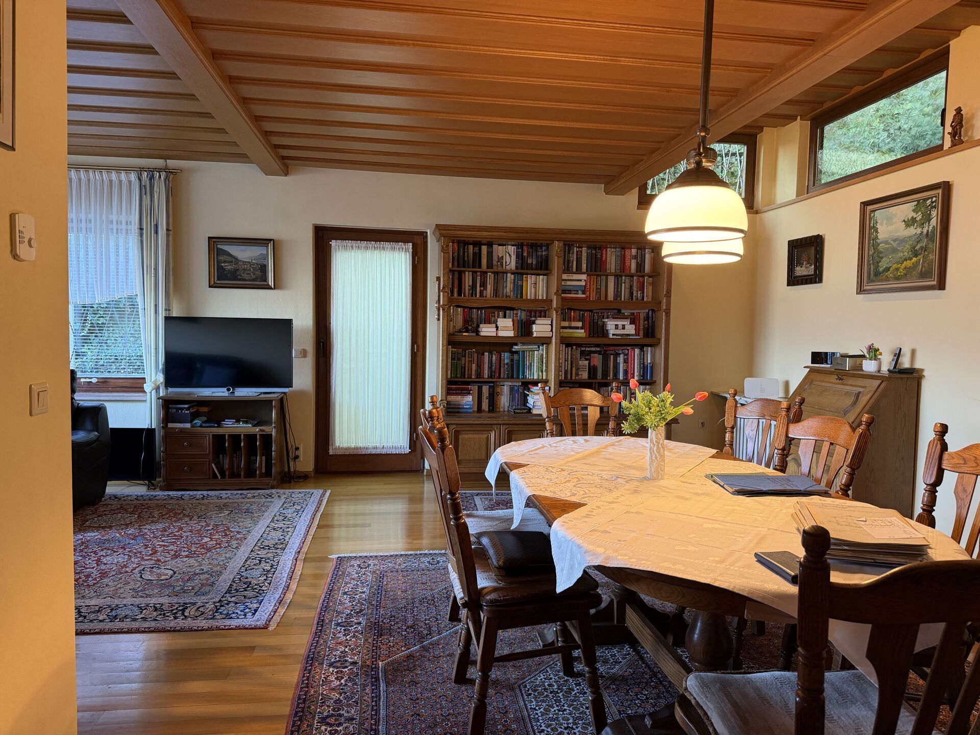 Der Wohn- und Essbereich schafft durch große Fensterflächen eine freundliche Wohnatmosphäre. Mehrere Terrassen und Außenbereiche erweitern den Wohnraum und laden zum Entspannen sowie zum Verweilen im Freien ein. Ein besonderes Highlight ist die schöne Aussicht in Richtung Rheintal, die dem Haus eine hohe Wohnqualität verleiht.