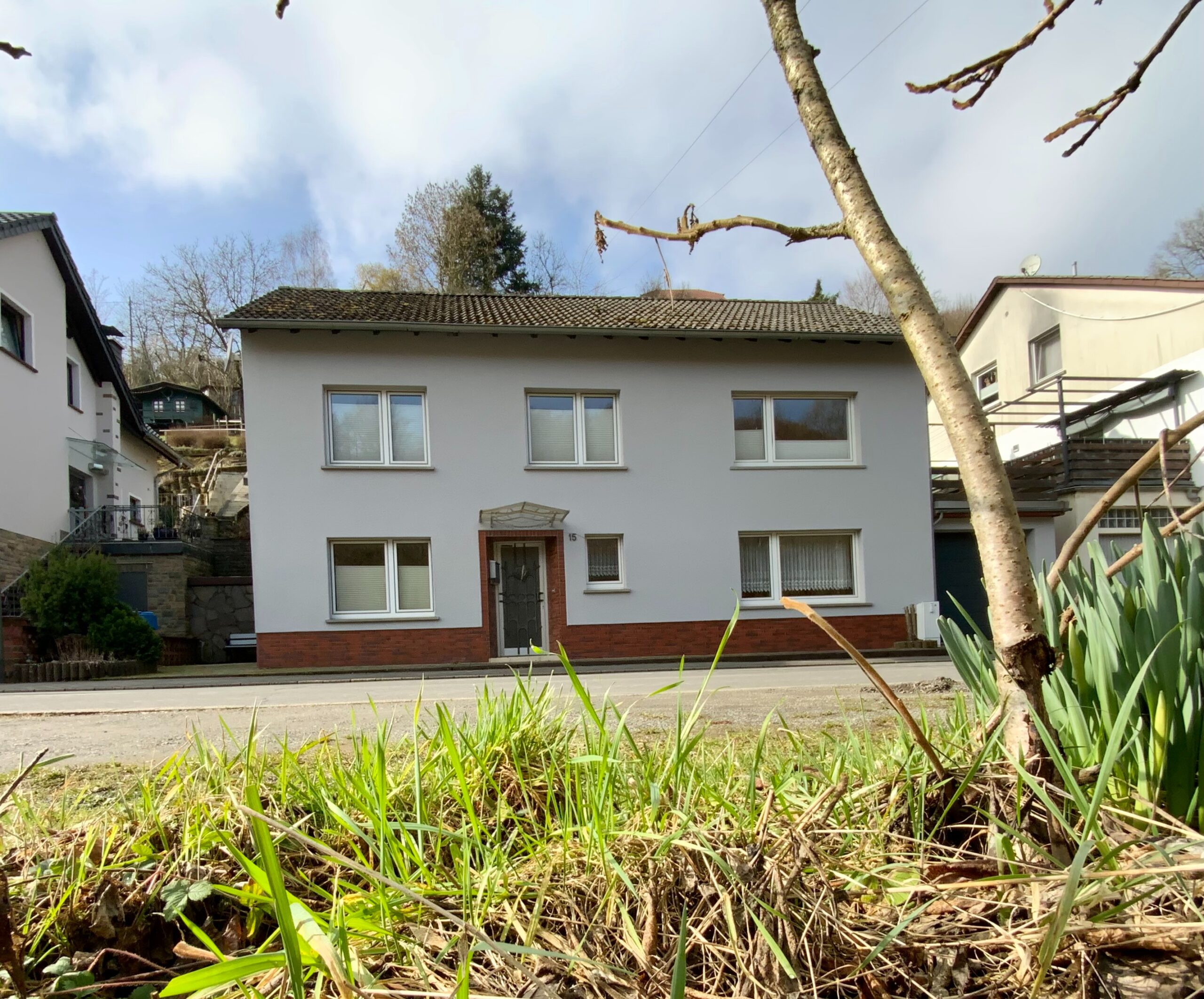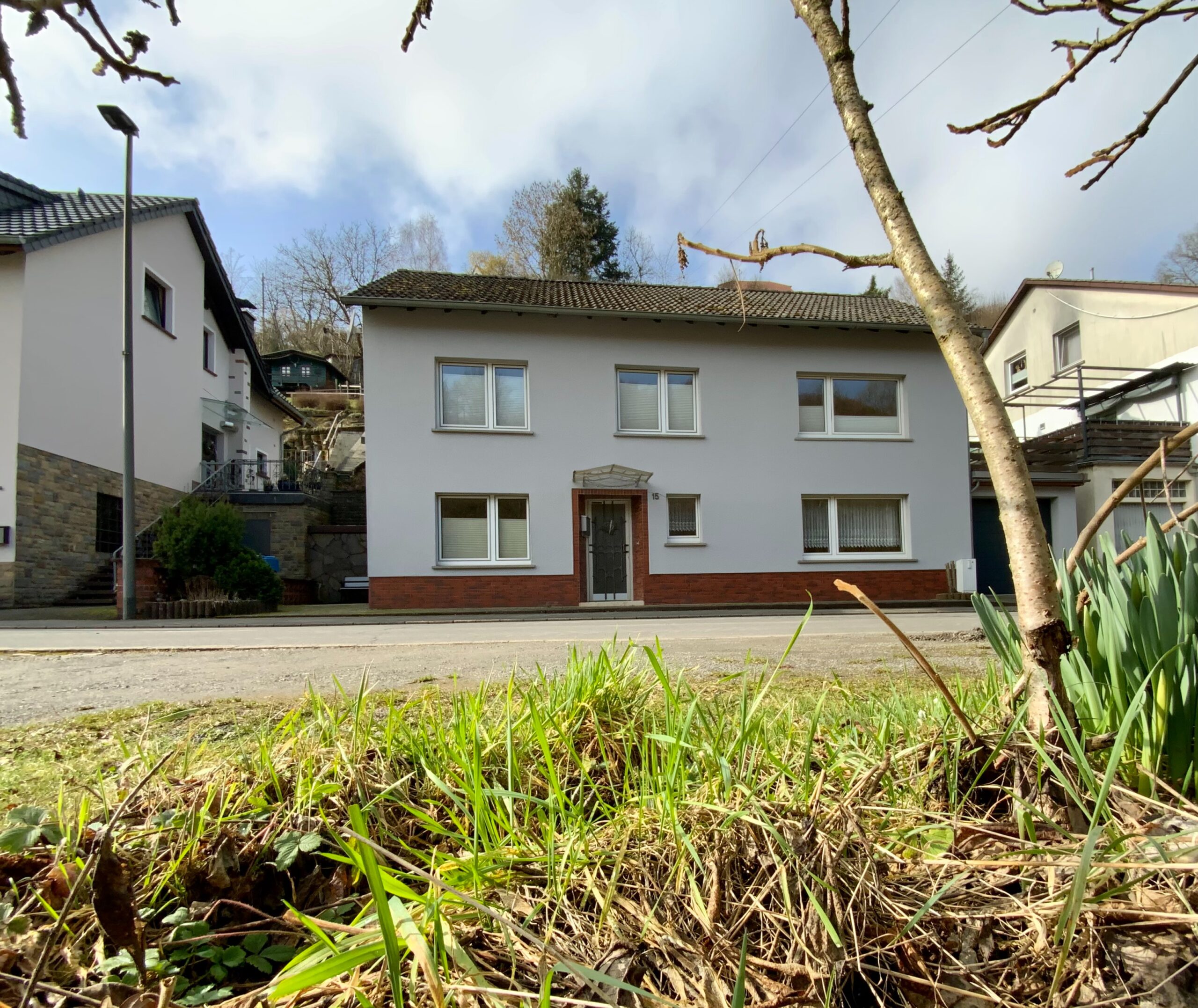 Die Vorderseite des Hauses bietet einen schönen Blick ins „Grüne“. Das Haus liegt in einer Sackgasse, welche nur von der anliegenden Nachbarschaft genutzt wird. Die Immobilie ist ideal für Menschen, die eine ruhige Wohnlage bevorzugen.