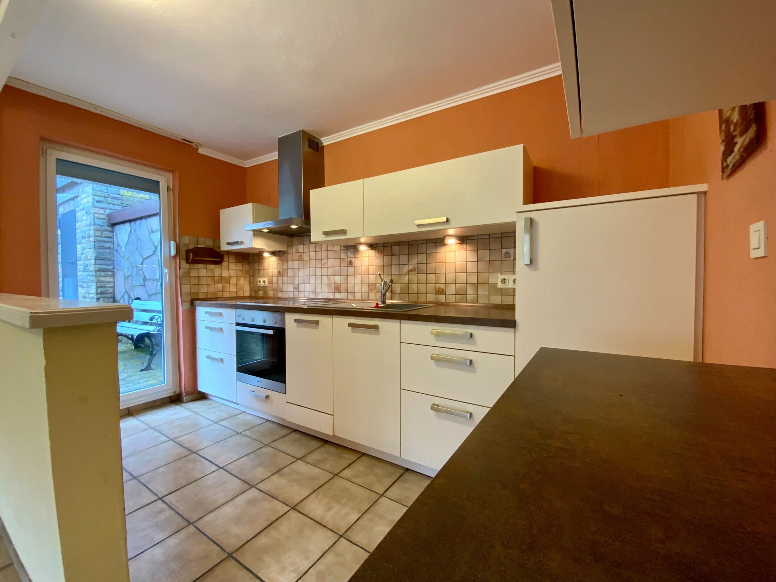 De keuken, van circa 16,4 m², heeft directe toegang tot het terras aan de linkerkant van het huis.