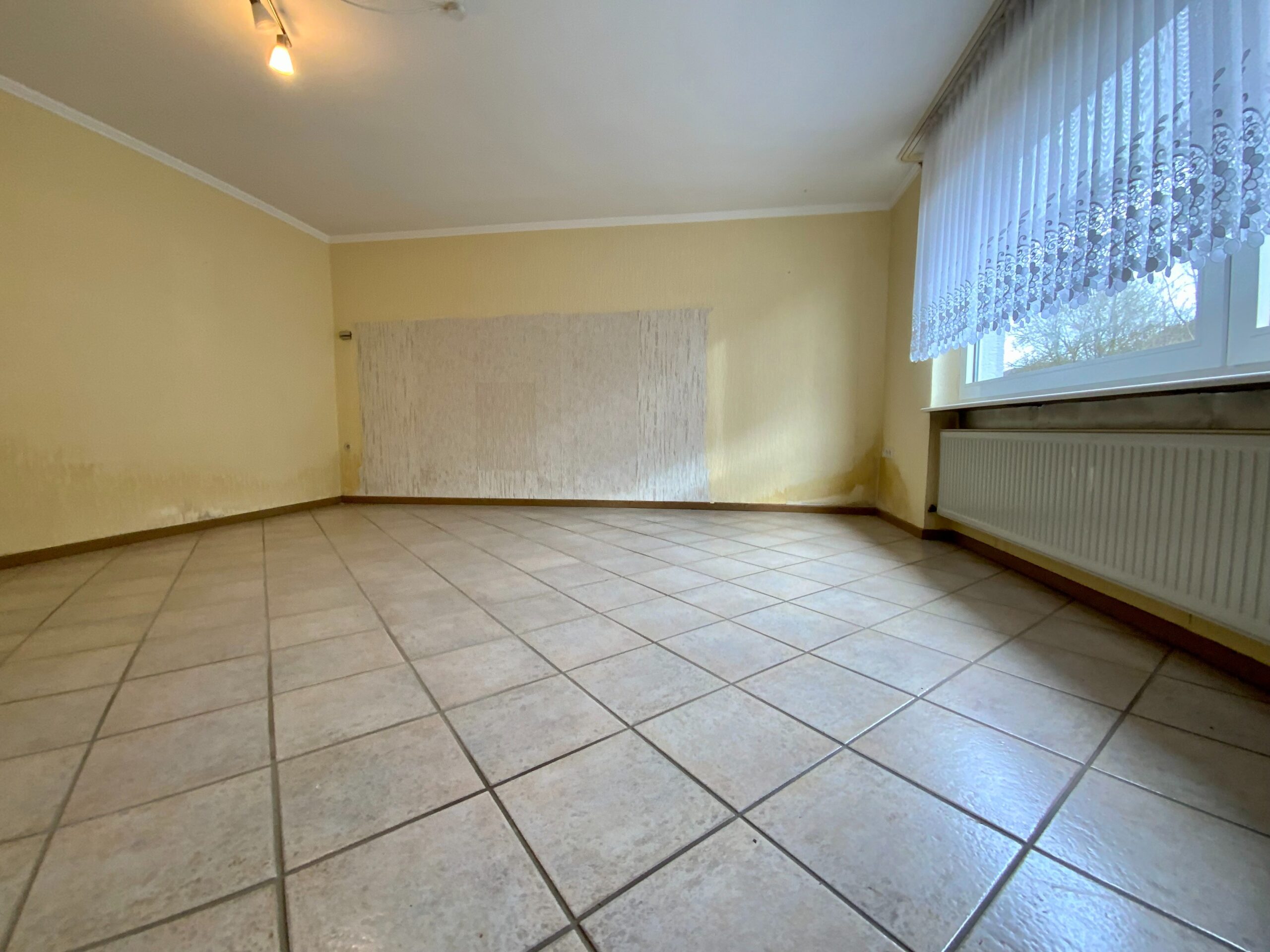 Das EG ist aufgeteilt in einen gefliesten Flur, Küche mit Zugang zu einer Terrasse, Wohnzimmer (ca. 20 m²), Gästetoilette, Waschraum, HWR-Raum und Garage.