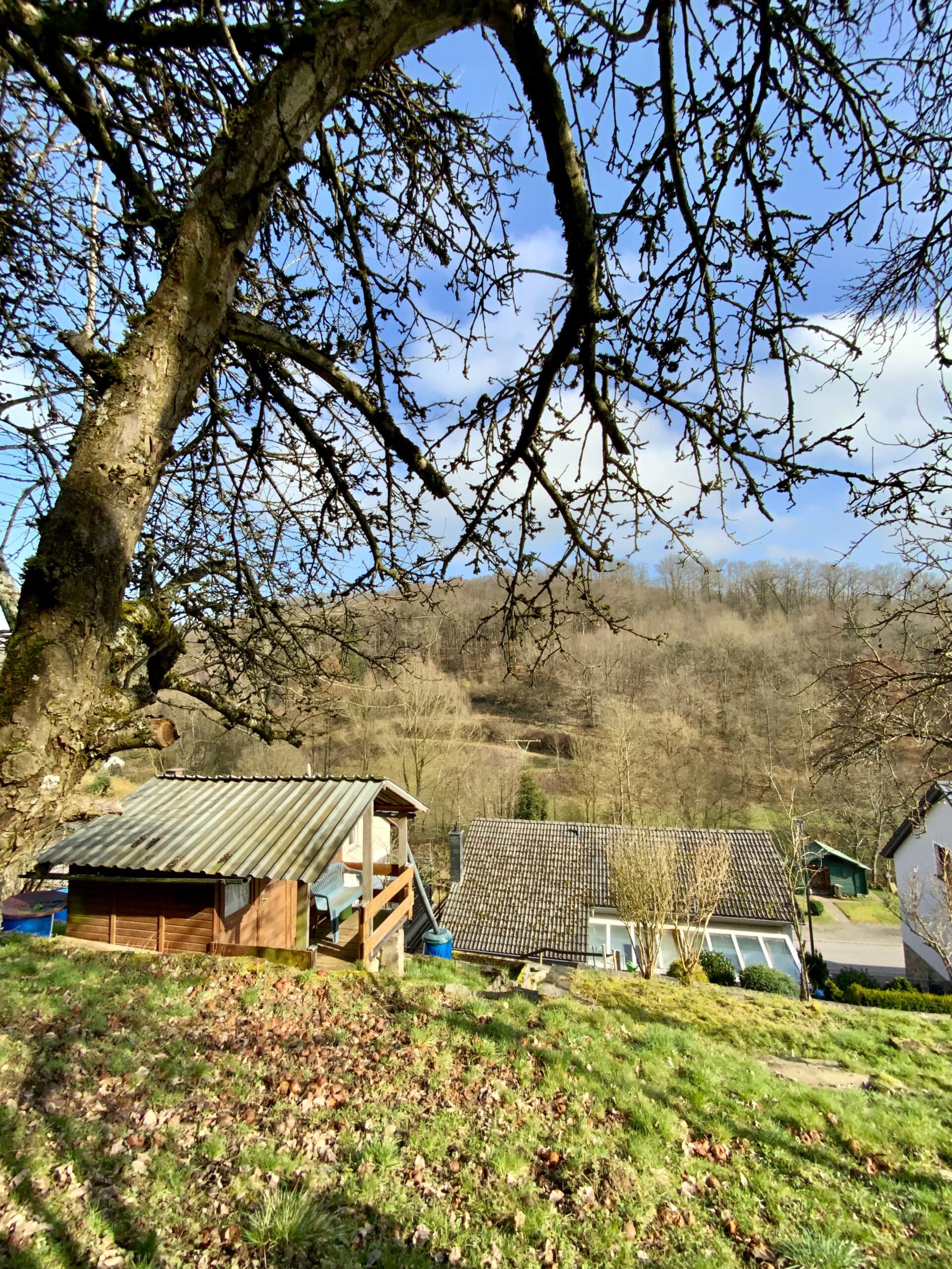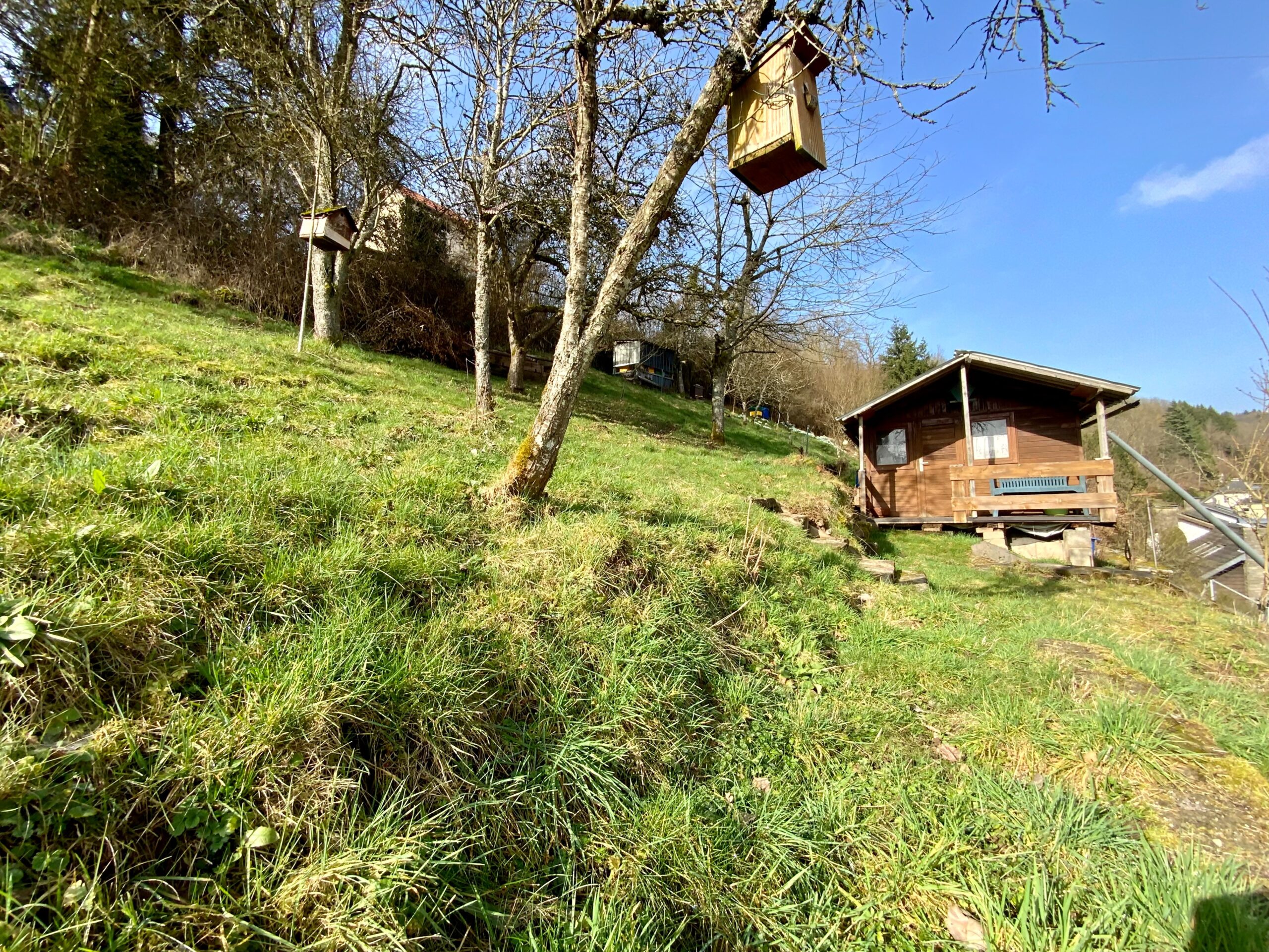 Das traumhafte Grundstück in Hanglage hat mehrere Sitzecken und ein schönes Gartenhaus.
