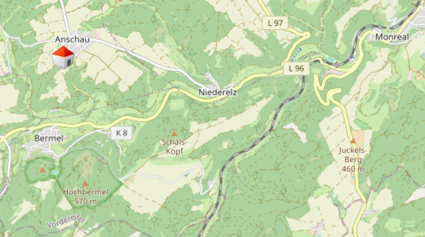 Das angebotene Wohnhaus befindet sich in ruhiger Randlage der Eifelgemeinde Anschau.Die Gemeinde Anschau mit ihren rund 300 Einwohnern liegt ruhig und idyllisch zwischen Wiesen und Feldern.Die Grundschule befindet sich in Boos. Eine Realschule plus gibt es im Nachbardorf Nachtsheim.Entfernungen:Mayen ca. 13 kmKaisersesch ca. 16 kmKelberg ca. 17 kmUlmen ca. 24 km