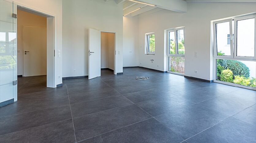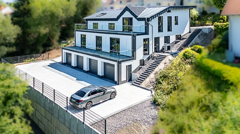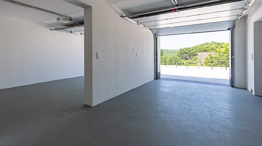 - Fußbodenheizung über eigene Luftwärmepumpe (Haustechnik im hinteren Teil der linken Garage)