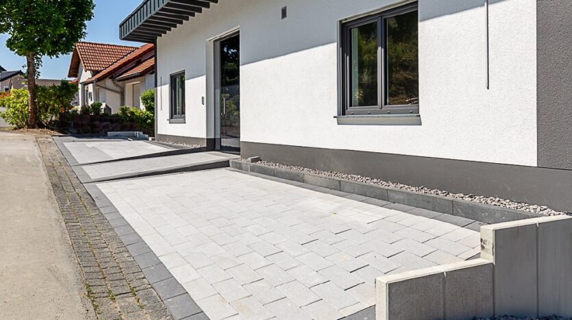 - gepflasterter Außenbereich: Hauseingang, Mülltonnenplatz, Zufahrt zu den Garagen, Hof vor den Garagen