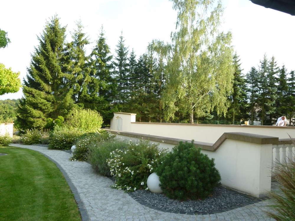Eine geschwungene Treppe aus maßgefertigten Sandsteinstufen verbindet Terrasse, Pool und Saunabereich auf stilvolle Weise. Sämtliche Wege sind befestigt und größtenteils mit hochwertigen Granitsteinen gepflastert.