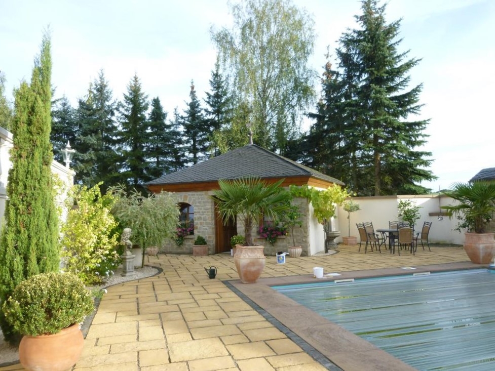 Die liebevoll gestaltete Außenterrasse mit Zierteich geht fließend in die Grünfläche über und eröffnet den Blick auf den ca. 9,20 x 4,50 Meter großen, beheizten Außenpool. Ergänzt wird dieser Bereich durch ein massiv gebautes Saunahaus mit Dusche – Ihre private Wellnessoase direkt am Haus.