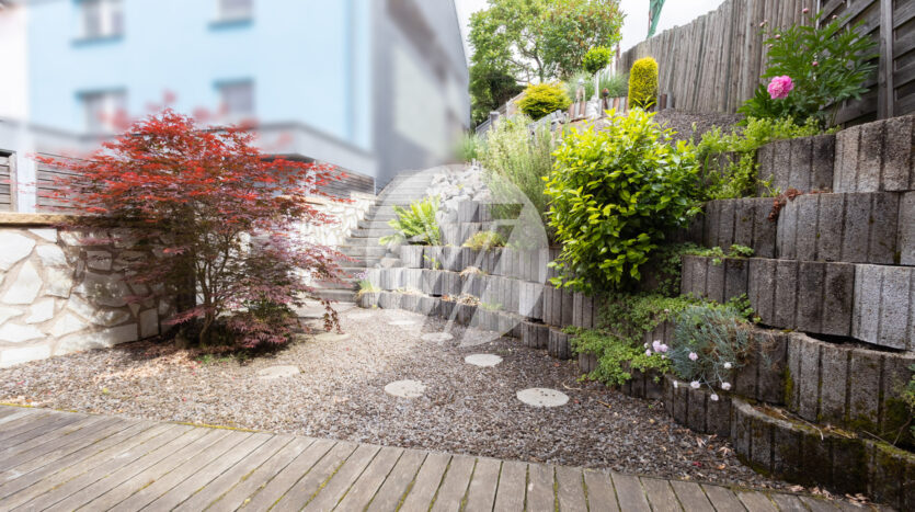 Der kleine Hanggarten sorgt für angenehme Privatsphäre und ermöglicht pflegeleichtes Gärtnern. Die Terrasse lädt zum Verweilen im Freien ein – hier lässt sich der Feierabend in ruhiger Umgebung wunderbar genießen.