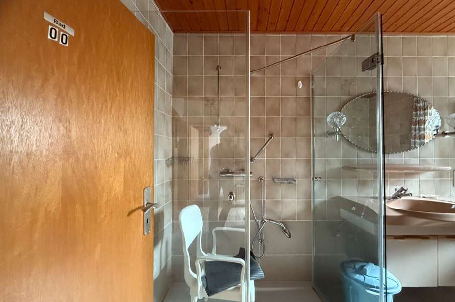 Erdgeschoss: Eingang, Treppenhaus, Diele, Esszimmer, Wohnzimmer, Küche, Abstellraum, Bad mit bodentiefer Dusche, Waschbecken, WC und Waschmaschinenanschluss. Treppe ins Obergeschoss