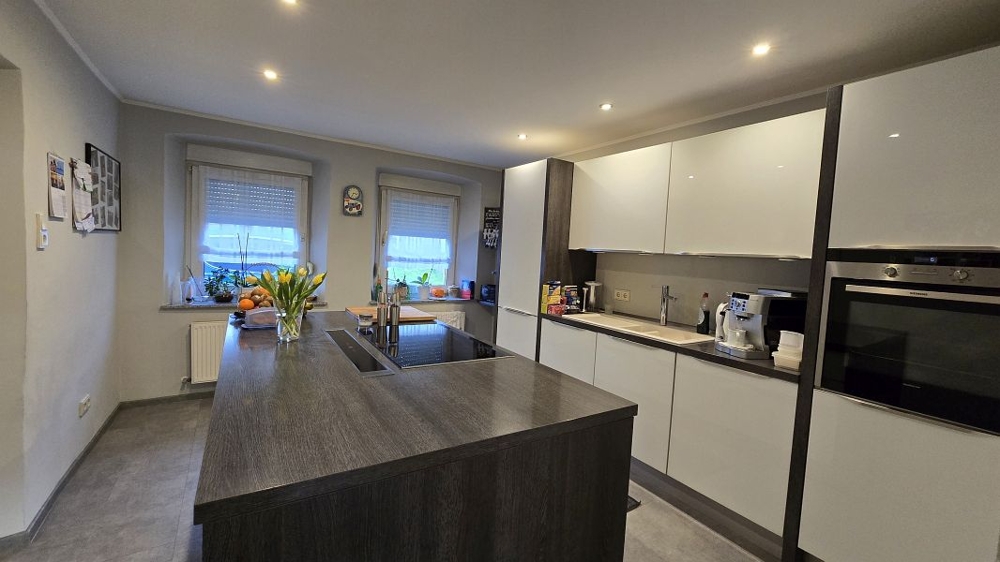 Im Erdgeschoss befinden sich die Diele, die Küche inklusive hochwertiger Einbauküche mit Kochinsel, ein Esszimmer mit Kaminofen, ein Wohnzimmer, ein Tageslichtbad mit Badewanne und ein Vorratsraum.