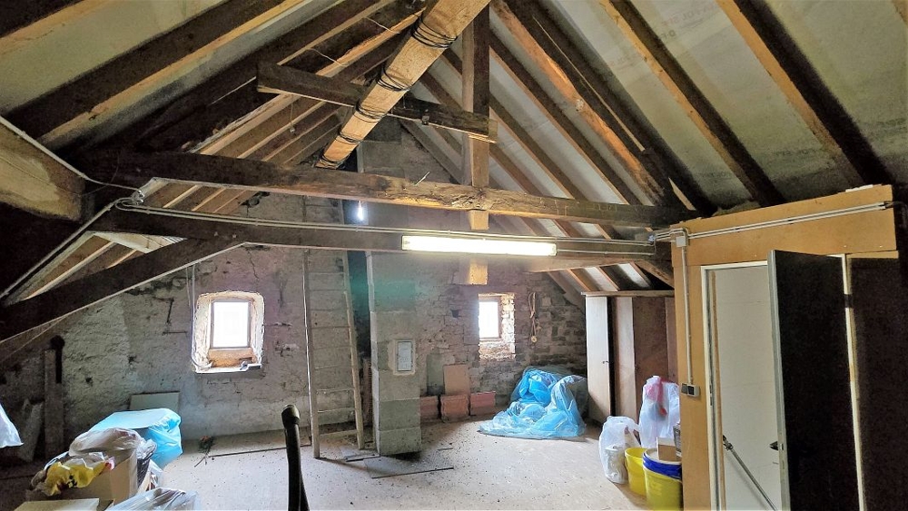 Eine weitere Holztreppe führt zum geräumigen Dachgeschoss. Das gesamte Dach inklusive Gebälk wurde in den 70er / 80er Jahre erneuert und befindet sich in einem hervorragenden Zustand.