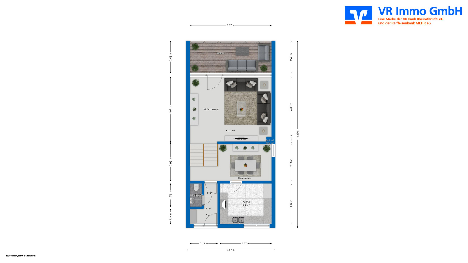 Flur; Gäste-WC; Esszimmer; Wohn-/Kochküche; großzügiges Wohnzimmer mit Austritt auf den Balkon;