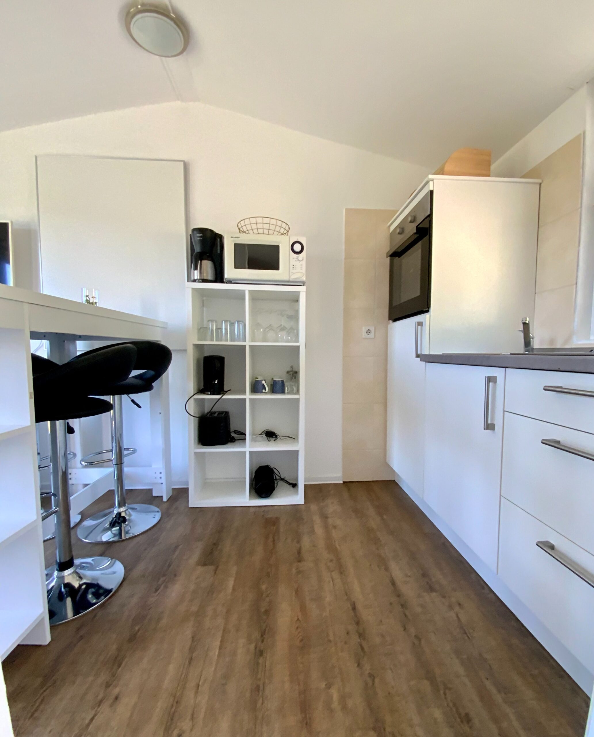 Bei der Küche handelt es sich um eine kleine Einbauküche mit Kochstelle und Arbeitsfläche.