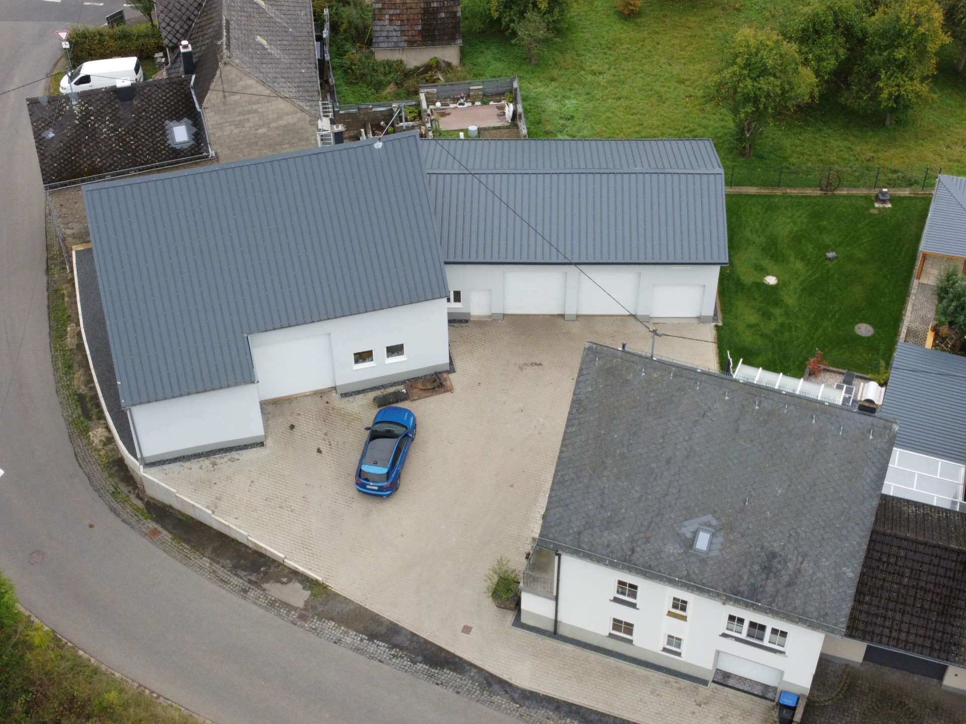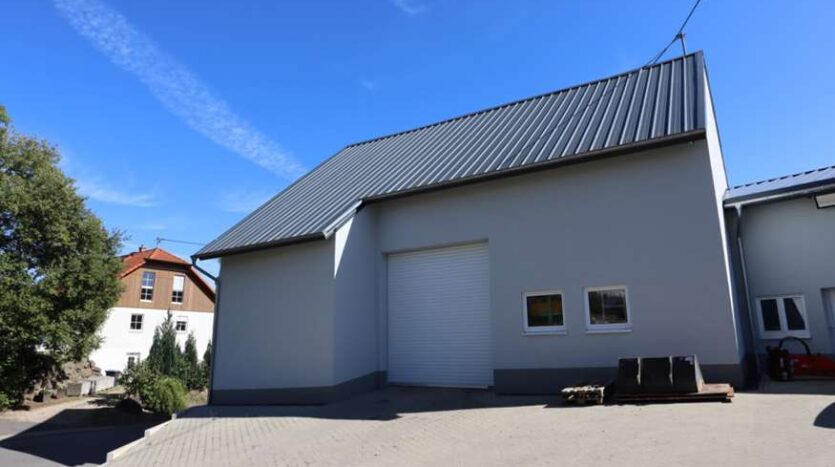 Das Objekt verfügt über zwei versetzt, miteinander verbundene Hallen die ebenfalls saniert wurden. Diese werden derzeit als Garage und Lagerhalle genutzt. Die Halle links ist 140 m² groß, und hat ein 3,8 x 4,0 m Tor. Die Halle rechts ist 85 m² groß mit zwei 3,0 x 3,0 m Toren. Die rechts daran angebaute Garage ist 21 m² groß und hat ein 2,5 x 2,5 m großes Tor. Die Elektrik der Hallen wurde komplett erneuert, hier finden sie 32 / 16 A Starkstrom.