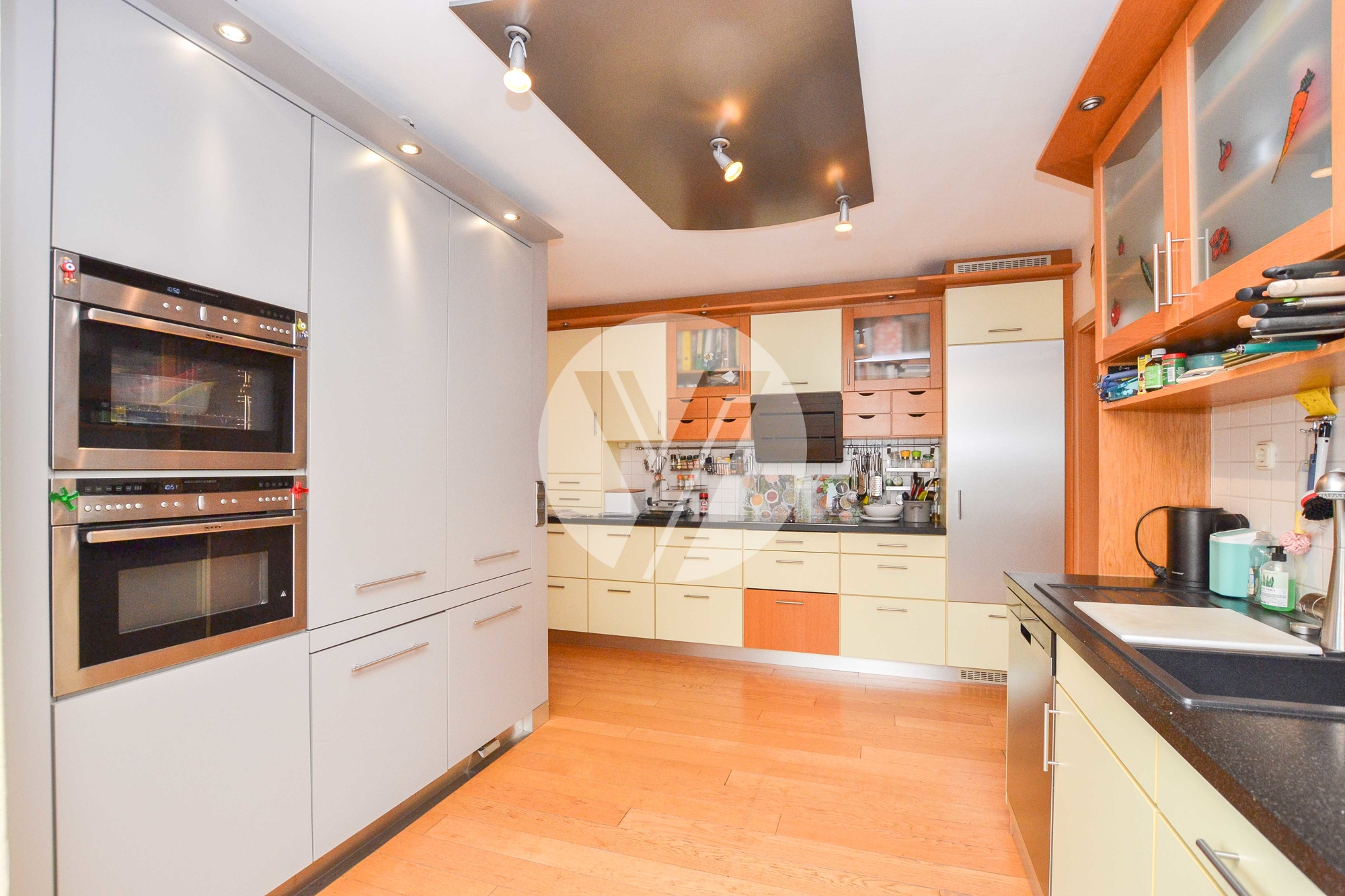 De circa 165 m² grote woning op de begane grond beschikt over een ruime woonkamer, een lichte eetkamer, een centrale keuken en een moderne, lichte serre. Deze verbindt de keuken met de woonkamer en vormt het lichtovergoten middelpunt van het appartement. Deze ruimte wordt gecompleteerd door een gastentoilet en een kleine kantoor-/logeerkamer.