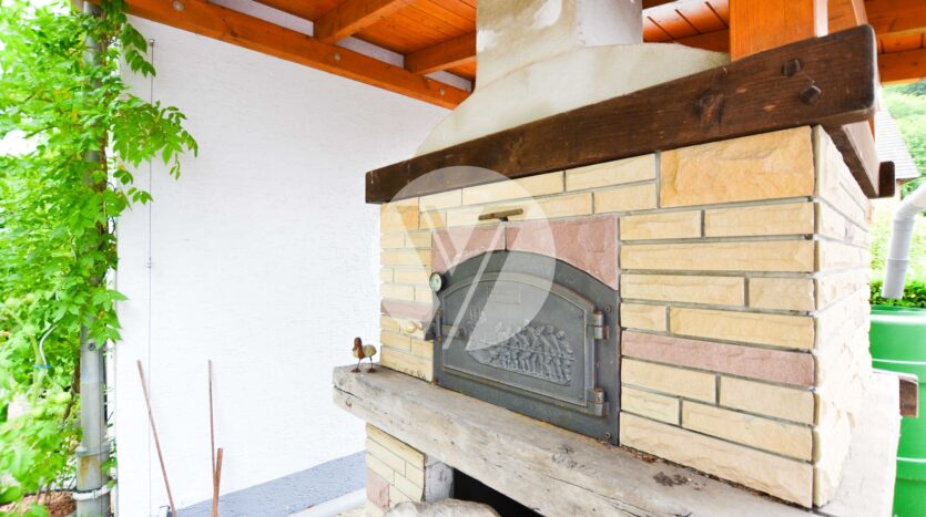 Het grote, zonnige perceel met prachtige bomen is zeer goed onderhouden en liefdevol aangelegd. Naast het grote overdekte terras biedt een natuurlijke vijver met een waterloop een unieke ambiance voor maximale rust en ontspanning. Een stenen, overdekte steenoven nodigt u uit om te genieten van speciale traktaties en gezellige momenten met familie en gasten.