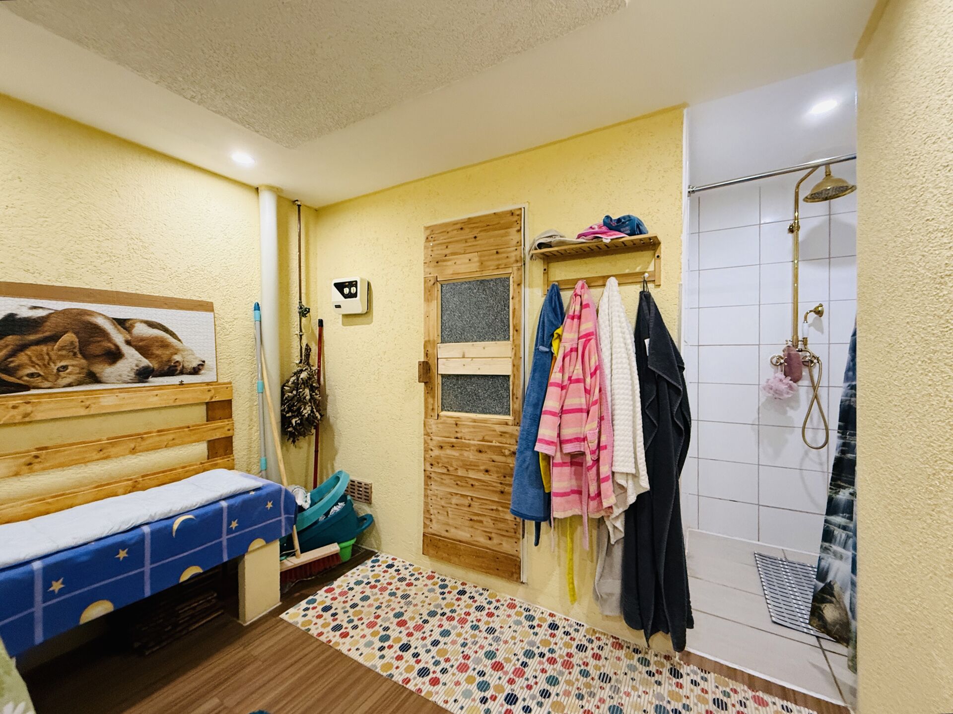 In het souterrain bevindt zich een aparte ruimte met een eigen ingang. Deze ruimte van circa 56 m² is verdeeld in drie kamers, waarvan één met bestaande keukenaansluitingen, en een doucheruimte. Ideaal als gastenverblijf, voor een ouder kind of als werkkamer.