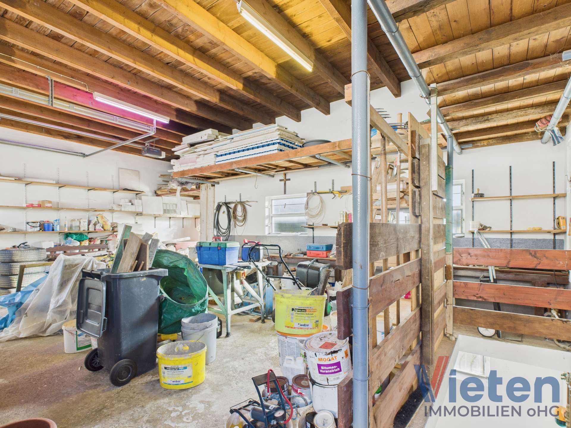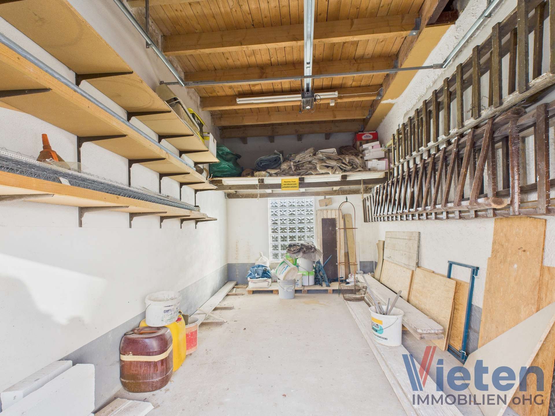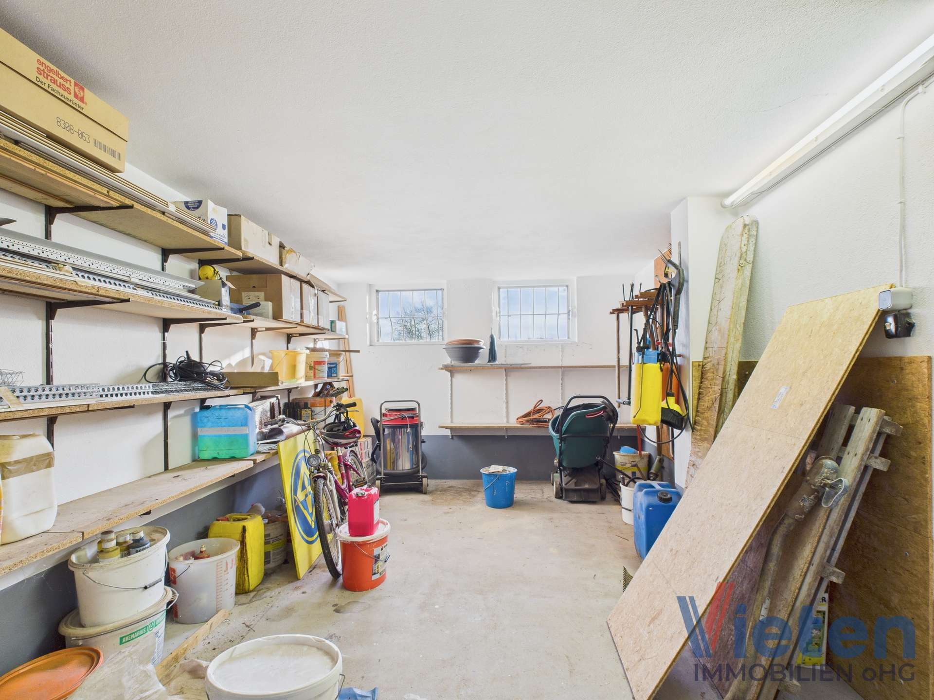 unterkellerter Garagenkomplex mit zwei elektrischen Sektionaltoren, Grube und Starkstrom