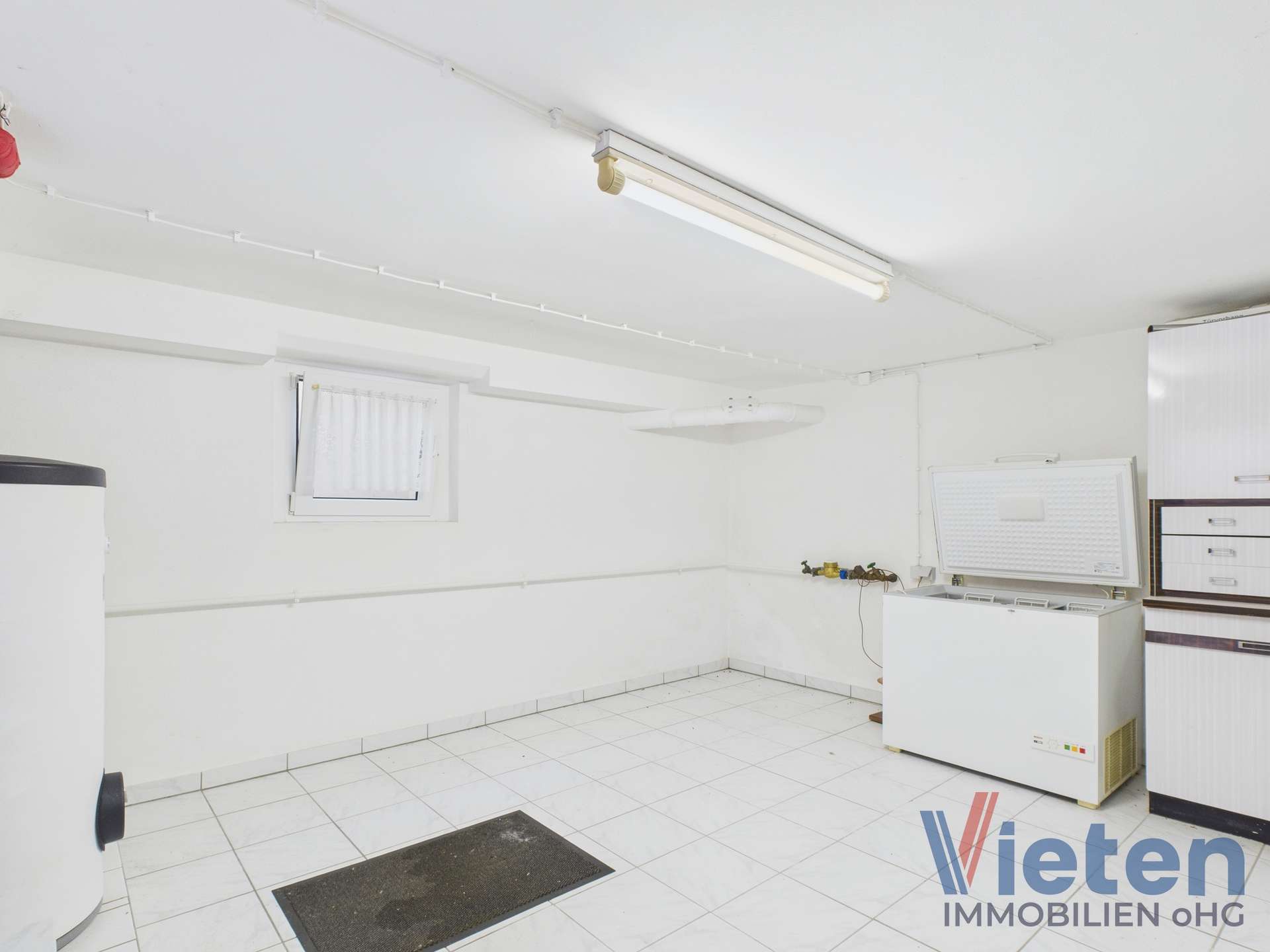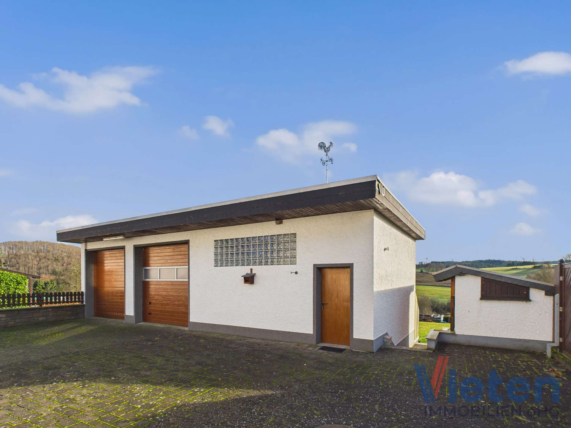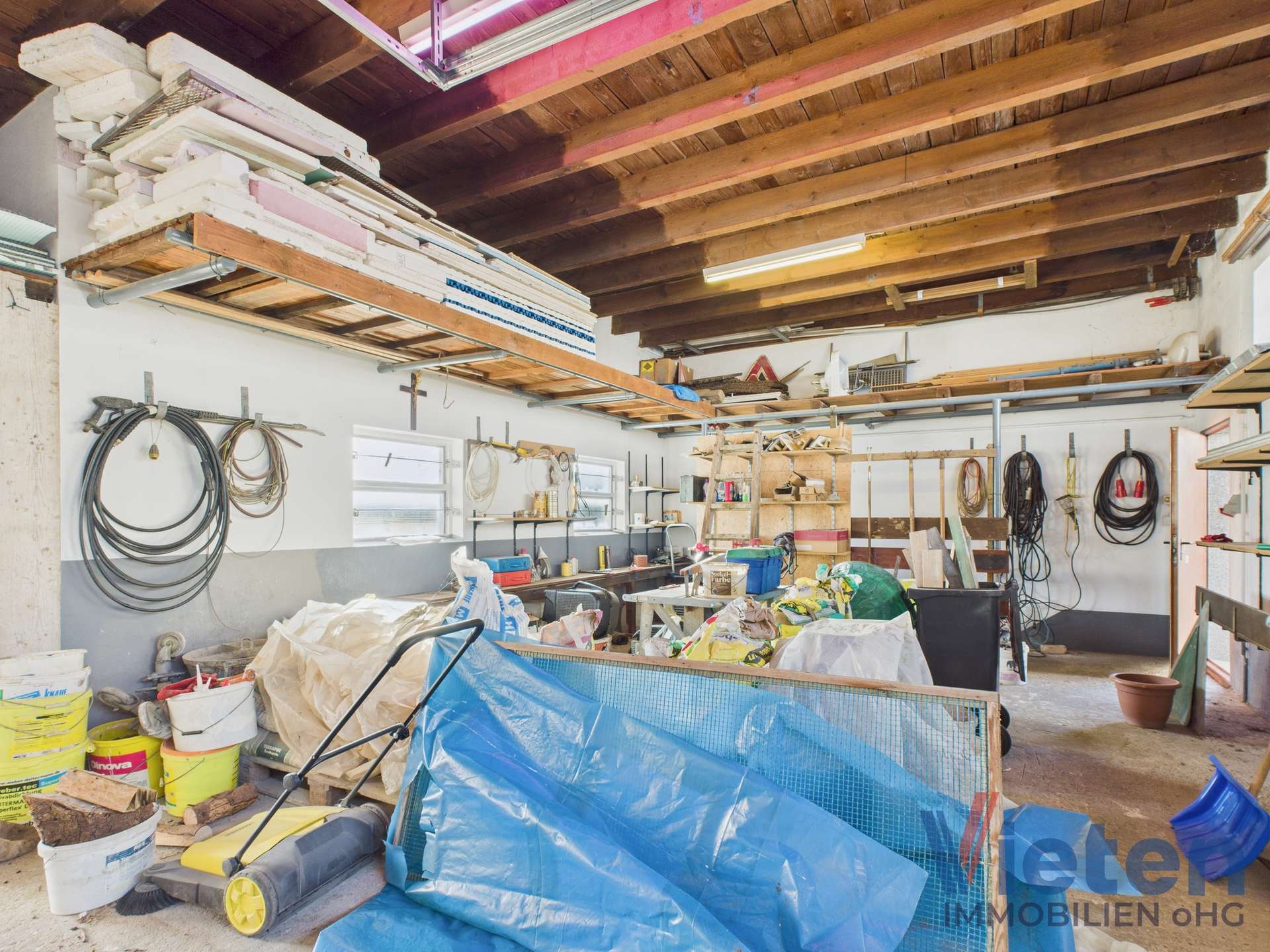 unterkellerter Garagenkomplex mit zwei elektrischen Sektionaltoren, Grube und Starkstrom