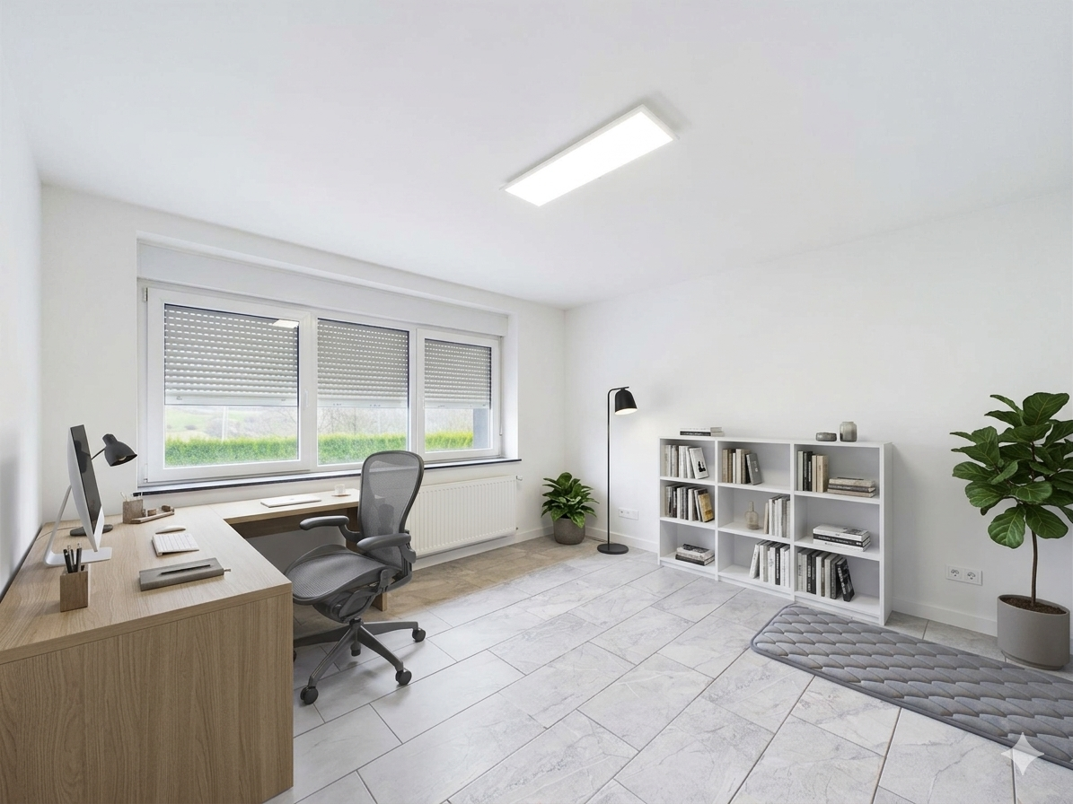 Im Erdgeschoss bildet der großzügige und helle Wohnbereich mit integrierter Küche den zentralen Lebensmittelpunkt. Von hier aus besteht direkter Zugang zur Terrasse hinter dem Haus und in den Garten. Das Gartengrundstück unmittelbar hinter dem Haus ist mit einem Doppelstabmattenzaun eingefriedet und bietet dadurch eine sichere, klar abgegrenzte Außenfläche, die sich für Kinder und Haustiere gleichermaßen eignet. Auf dieser Ebene befindet sich zudem ein weiteres Zimmer, das flexibel als Schlaf-, Arbeits-, Gäste- oder Hobbyraum genutzt werden kann. Im hinteren Bereich liegt ein geräumiges Tageslichtbad. Dieses befindet sich aktuell noch im Ausbau, wird jedoch bis zur Hausübergabe im Herbst 2026 vollständig fertiggestellt.