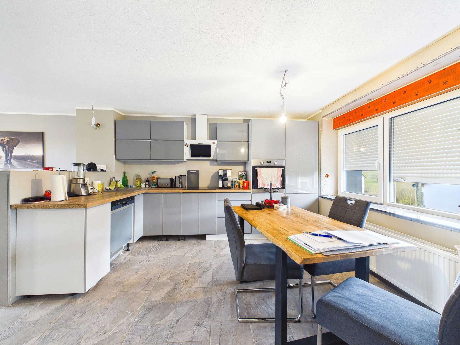Die Fenster im Erdgeschoss sind alle doppelt verglaste Kunststoff-Fenster aus 2024. Auf dieser Etage sind elektrische Rollladen verbaut. Die ebenfalls doppelt verglasten Fenster im Obergeschoss stammen aus 2006 und 1981.