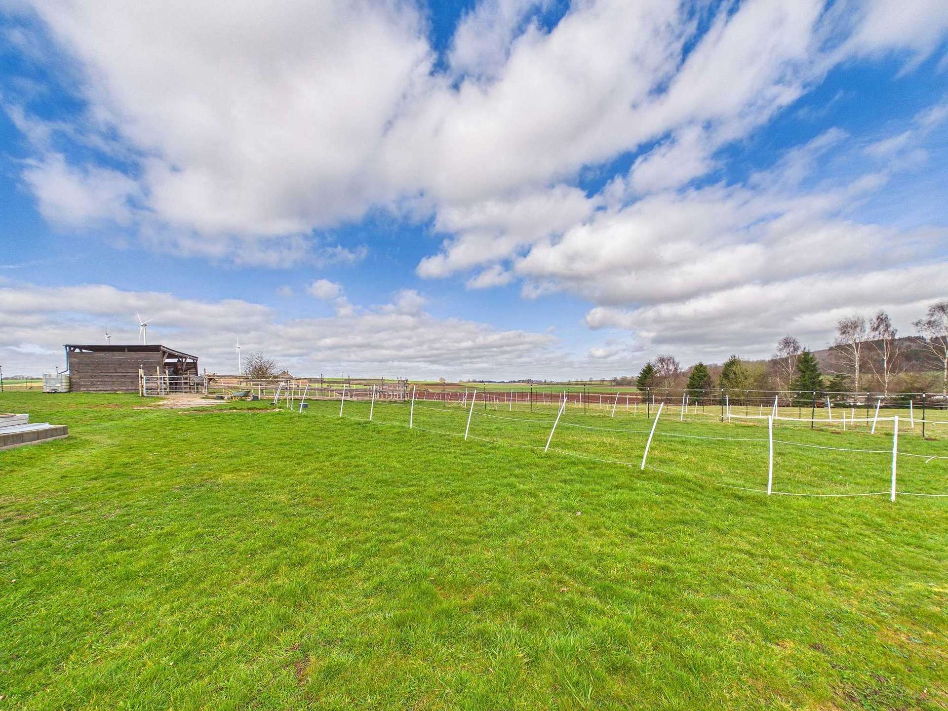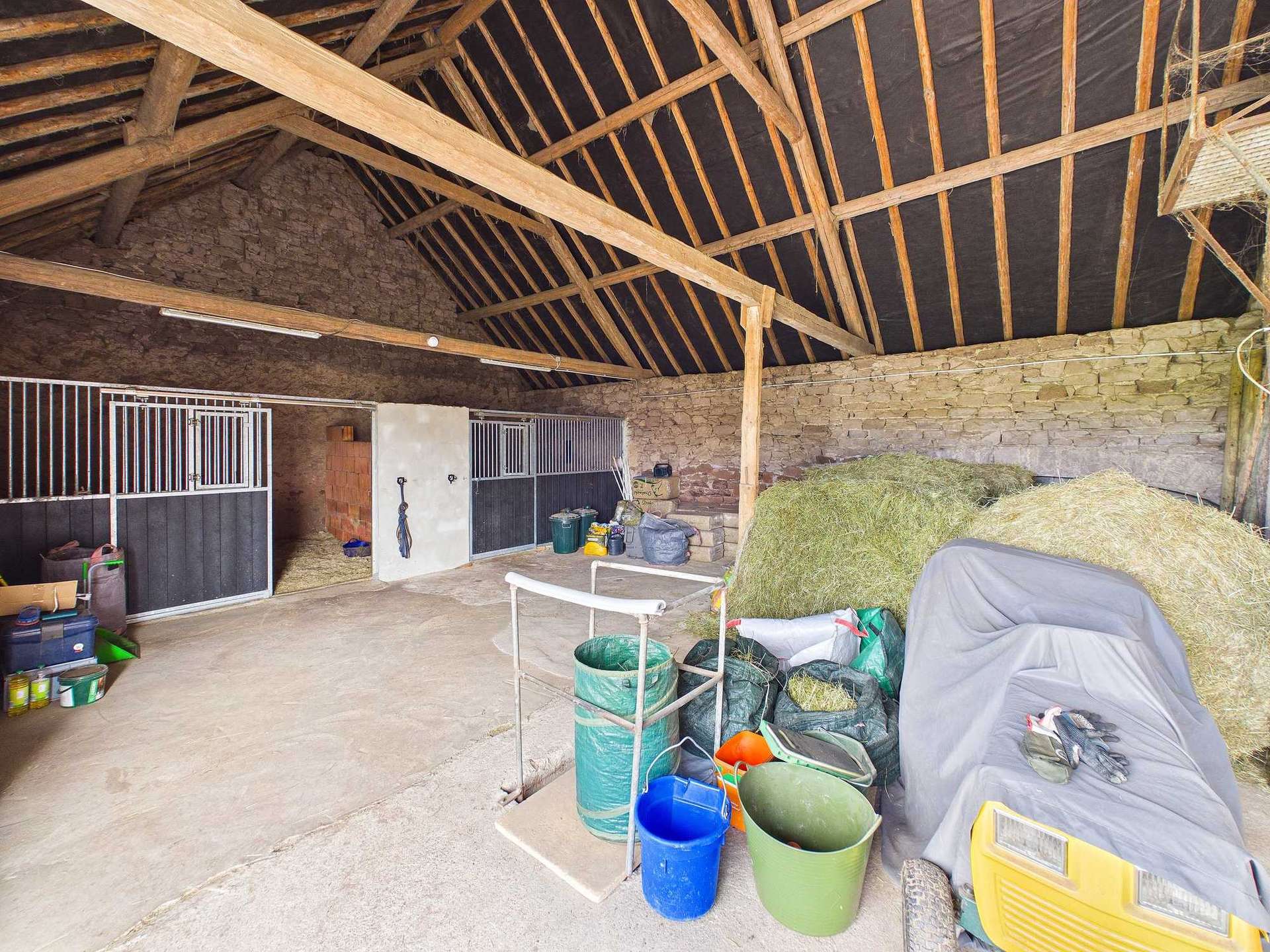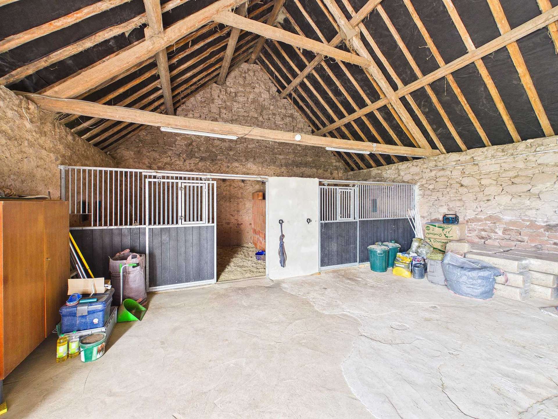 Rechtsseitig ist ein Nebengebäude angebaut. Die vorhandene Scheune und Stallungen bilden zusammen mit dem ca. 5.201 m² großen Grundstück eine geeignete Grundlage für Tierhaltung und vielseitige Nutzungsmöglichkeiten im landwirtschaftlichen oder handwerklichen Bereich. Nach Aussage der Eigentümerin darf man den bestehenden Baukörper auch noch um einen Anbau erweitern bzw. auch eine Garage oder ein Gartenhaus errichten. Mehrere Stallbereiche können zur Unterbringung von Tieren, als Lagerflächen oder als Werkstatt genutzt werden. Auch die Einrichtung eines Hühnerstalls sowie eines Holzlagers ist möglich. Über dem Stall befindet sich ein Heuboden, der bereits umgebaut wurde und aktuell zwei Pferdeboxen beherbergt.