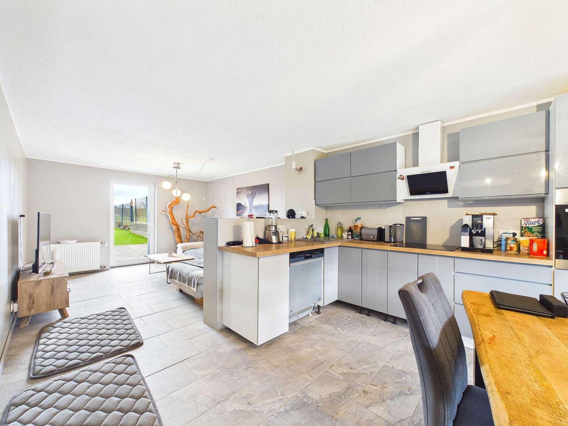 Im Erdgeschoss bildet der großzügige und helle Wohnbereich mit integrierter Küche den zentralen Lebensmittelpunkt. Von hier aus besteht direkter Zugang zur Terrasse hinter dem Haus und in den Garten. Das Gartengrundstück unmittelbar hinter dem Haus ist mit einem Doppelstabmattenzaun eingefriedet und bietet dadurch eine sichere, klar abgegrenzte Außenfläche, die sich für Kinder und Haustiere gleichermaßen eignet. Auf dieser Ebene befindet sich zudem ein weiteres Zimmer, das flexibel als Schlaf-, Arbeits-, Gäste- oder Hobbyraum genutzt werden kann. Im hinteren Bereich liegt ein geräumiges Tageslichtbad. Dieses befindet sich aktuell noch im Ausbau, wird jedoch bis zur Hausübergabe im Herbst 2026 vollständig fertiggestellt.