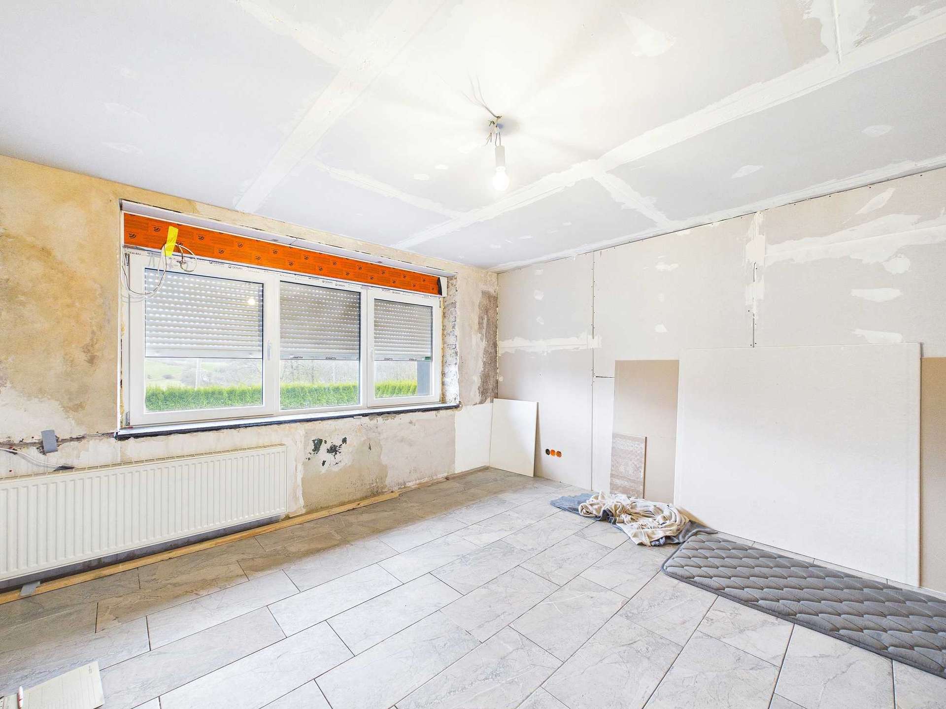 Generell stehen im Erdgeschoss noch abschließende Sanierungsarbeiten an, die vollständig durch den Verkäufer ausgeführt werden. Dazu zählen unter anderem die Montage der Türzargen und Türblätter, das Verfugen der Fliesen sowie die finalen Putz- und Malerarbeiten. Die Etage wird insgesamt umfassend saniert und bezugsfertig übergeben.