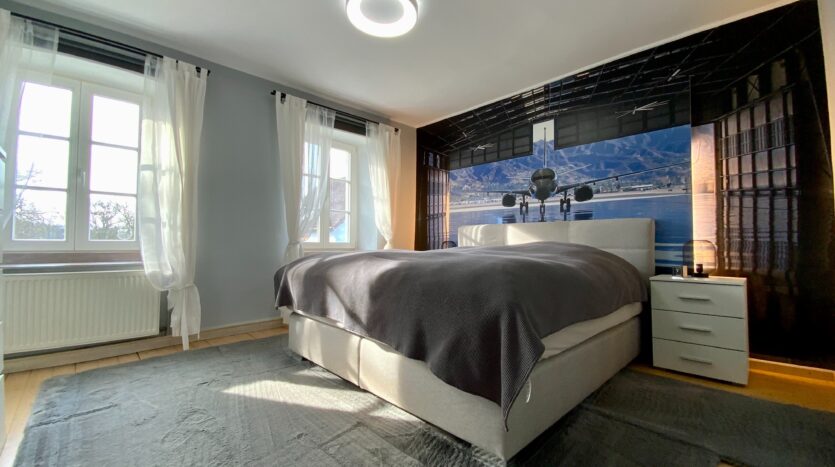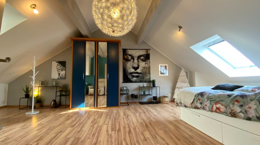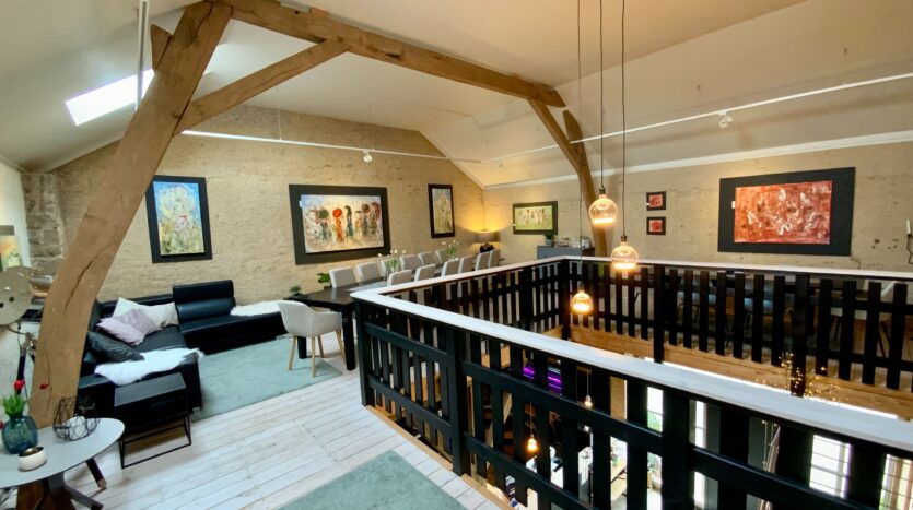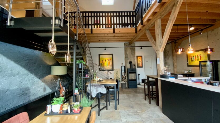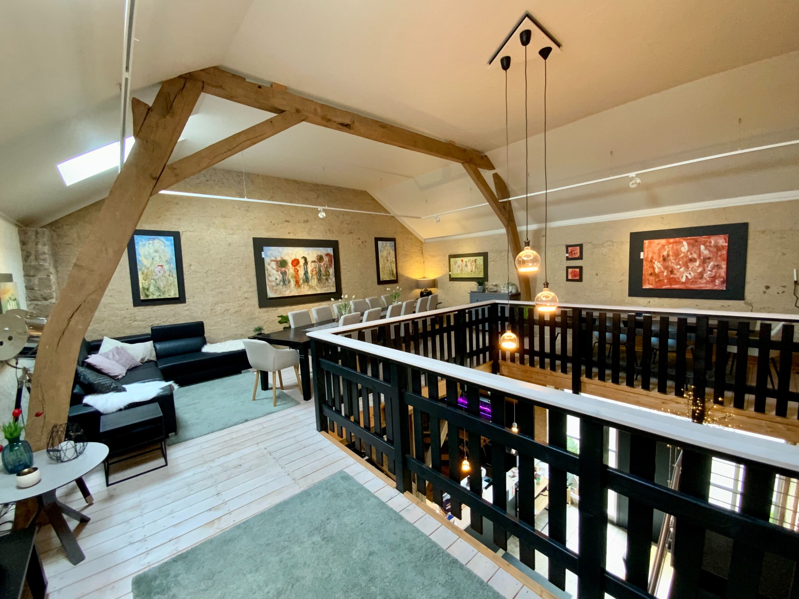 Das Loft ist das nächste Highlight der Immobilie. Es wurde komplett mit natürlichen Materialien saniert und ist traumhaft gestaltet. Die umgebaute Scheune mit seiner unglaublichen Höhe ist bis unter das Dach sichtbar und offen gestaltet.